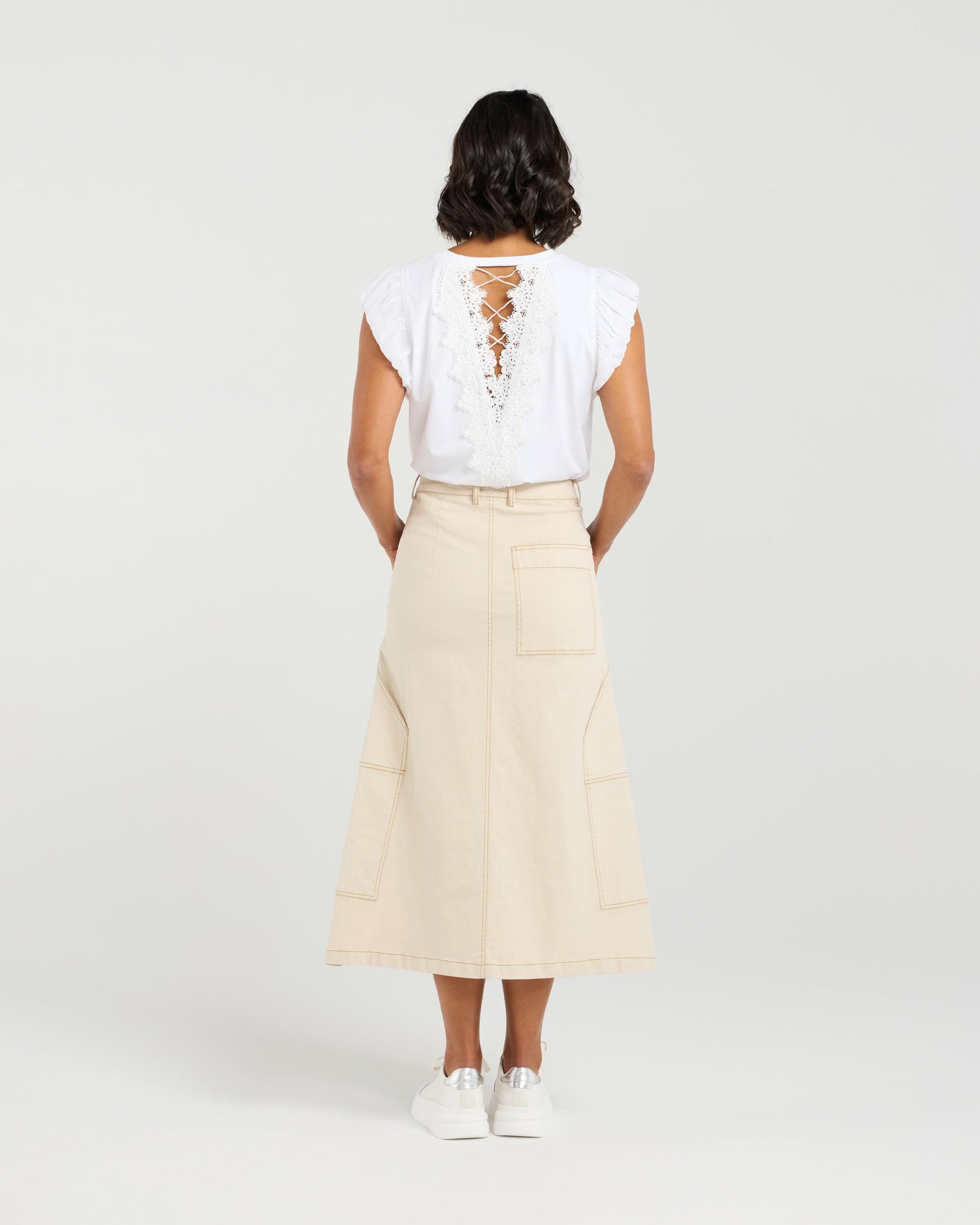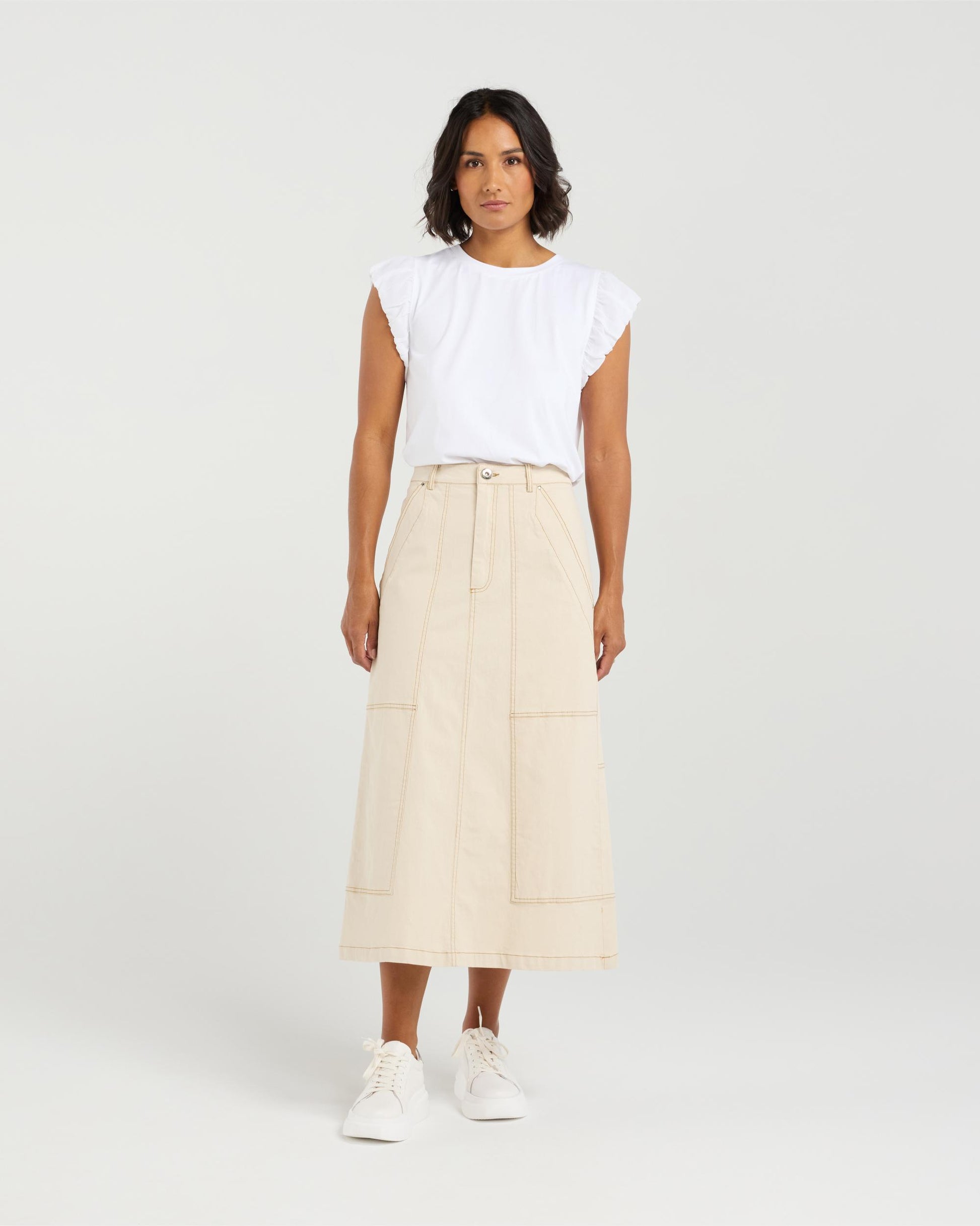 A fresh interpretation of a wardrobe staple, this mid-length A-line skirt channels the spirit of denim in a non-denim fabrication for a lighter, more refined feel. Designed with utility-inspired pockets and contrast stitching, it combines workwear elements with a feminine silhouette. The structured shape and clean finish make it a versatile piece that will become a wardrobe workhorse.