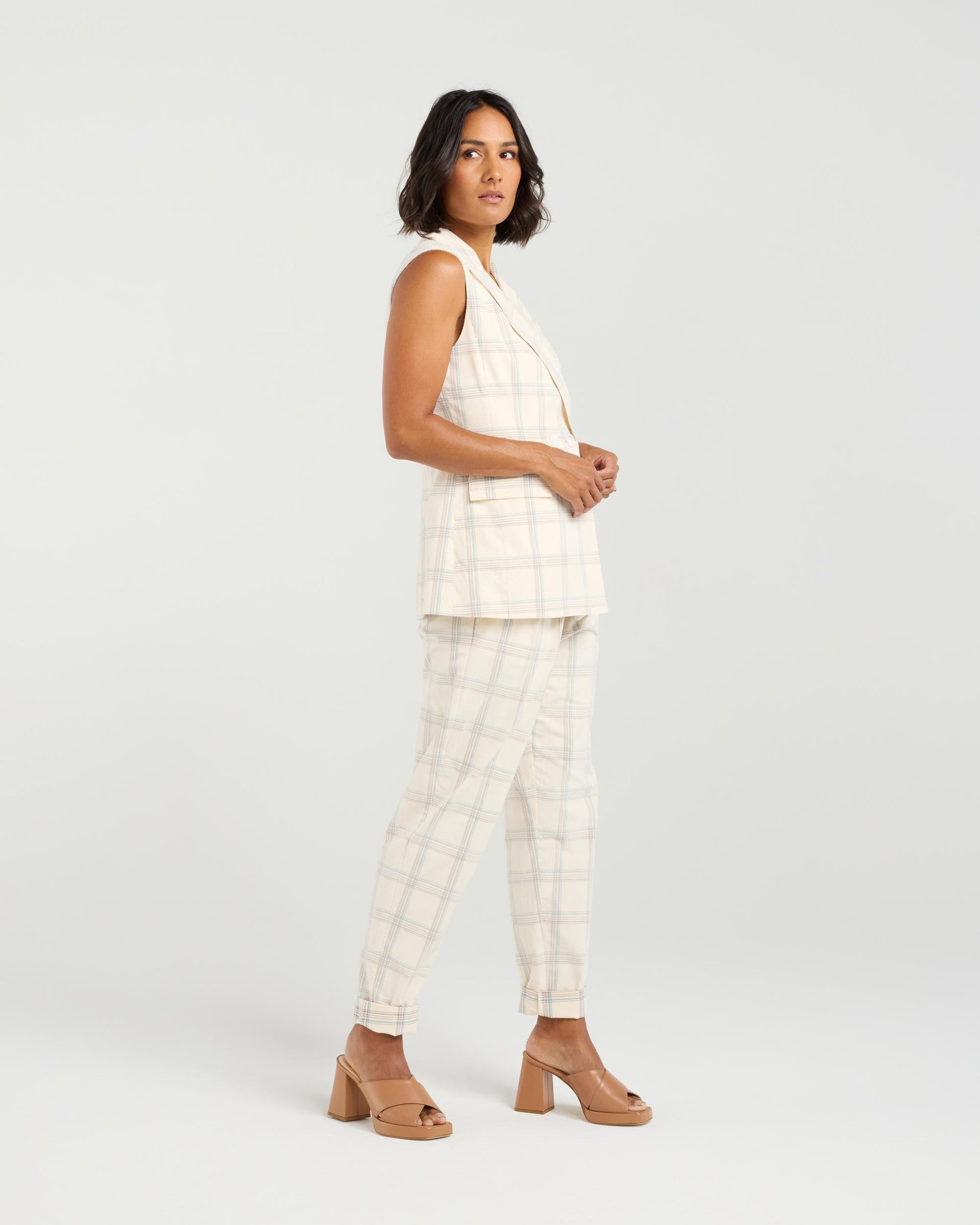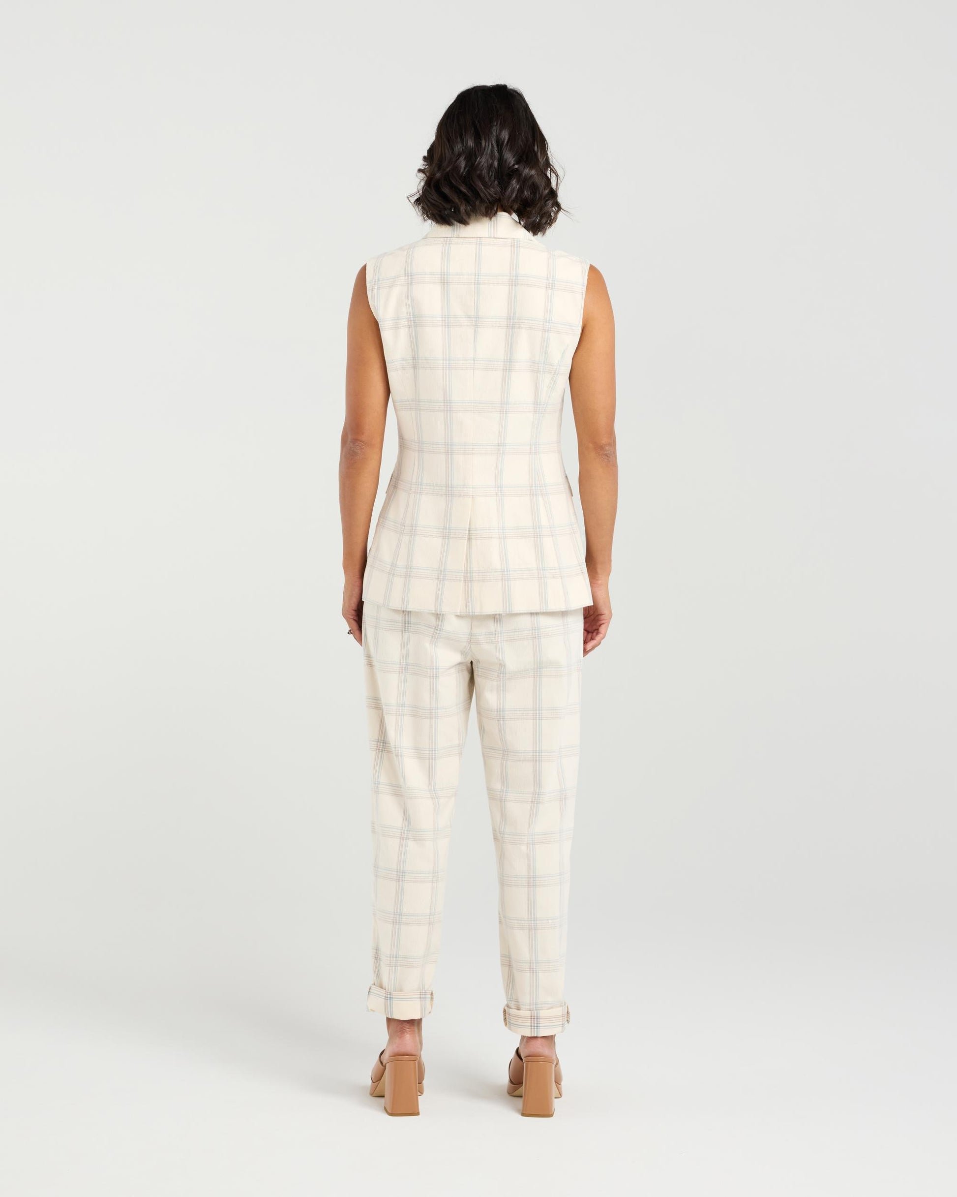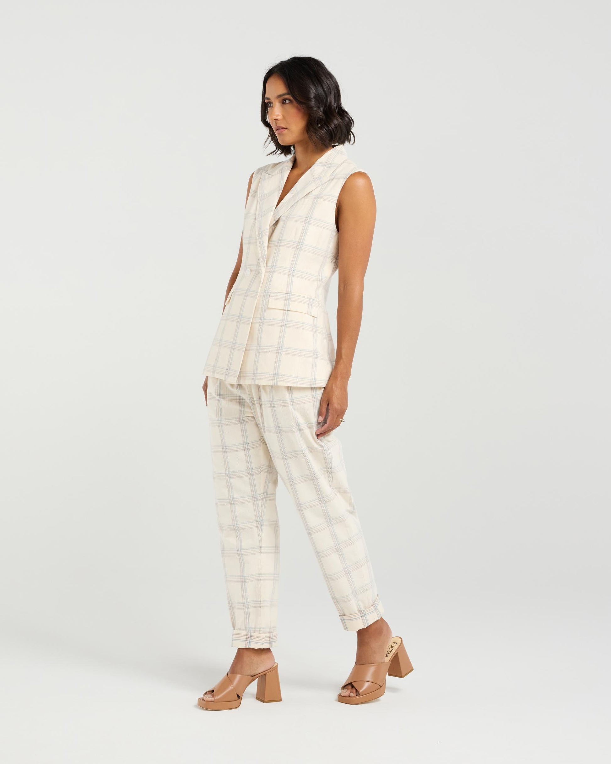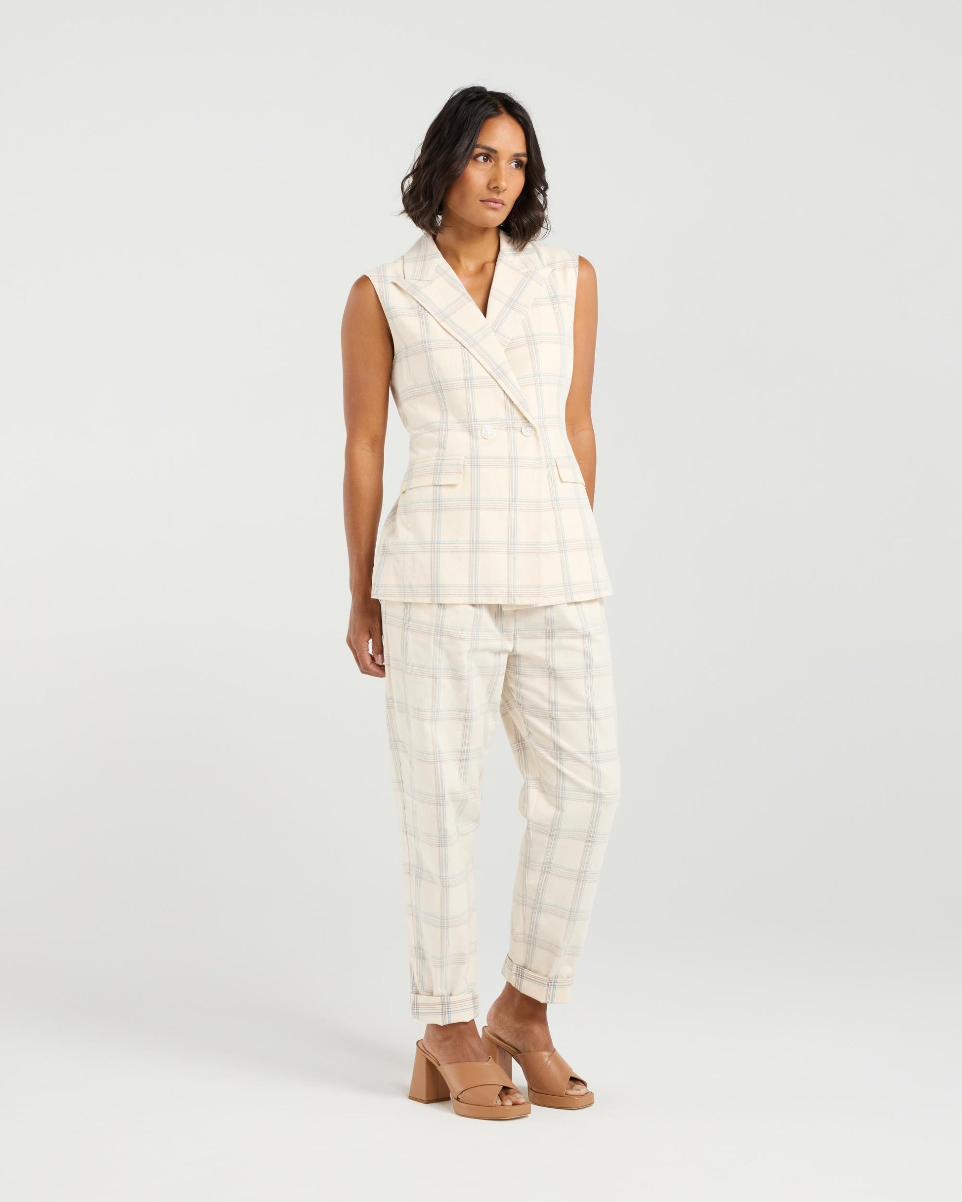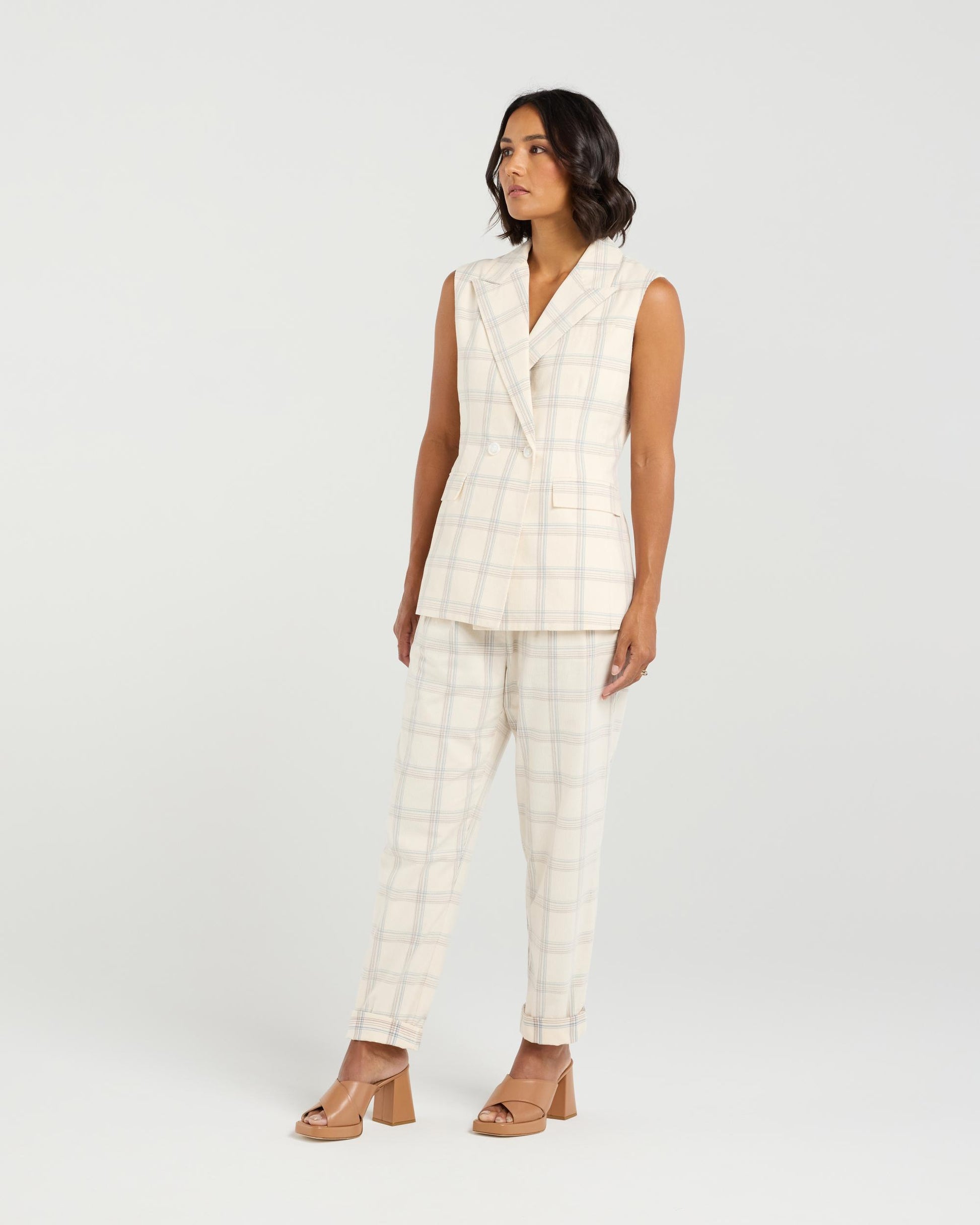 Add a dash of cool to any outfit with this sleek sleeveless vest. Featuring sharp collar and lapel detailing, it’s all about tailored charm—with a twist. The double button front brings structure and style, while subtle pocket welts give it that polished, put-together vibe. Layer it up or let it shine solo—this vest plays well with everything. Pair with the Sarah Pant in the matching fabric for the ultimate in chic spring summer suiting.