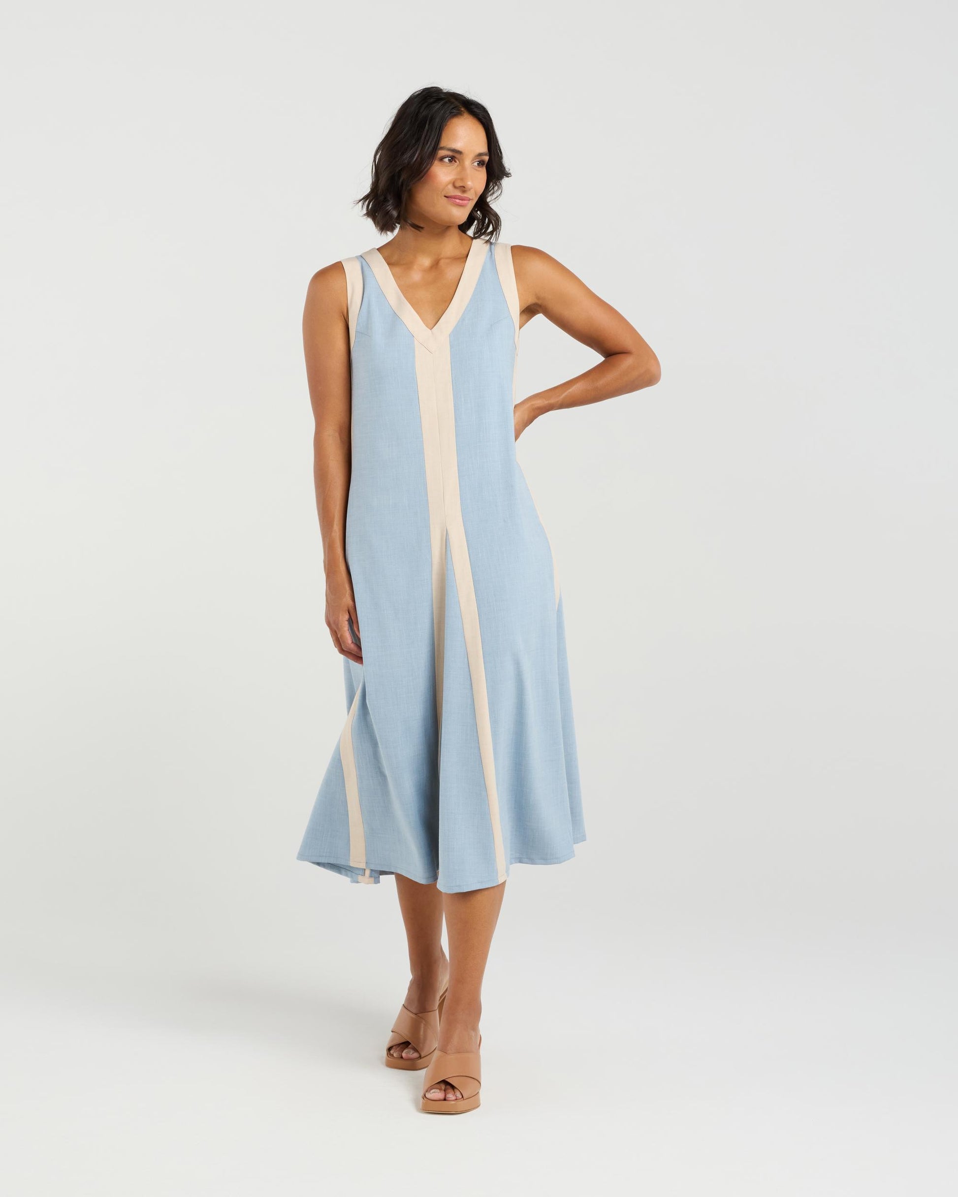 Striking in its simplicity, this sleeveless V-neck dress is designed to flatter with clean lines and thoughtfully placed contrast panels that elongate the silhouette. Cut for ease and movement, the streamlined shape is elevated by the unexpected practicality of side pockets. A modern essential that balances structure and softness—perfect for day-to-night wear.