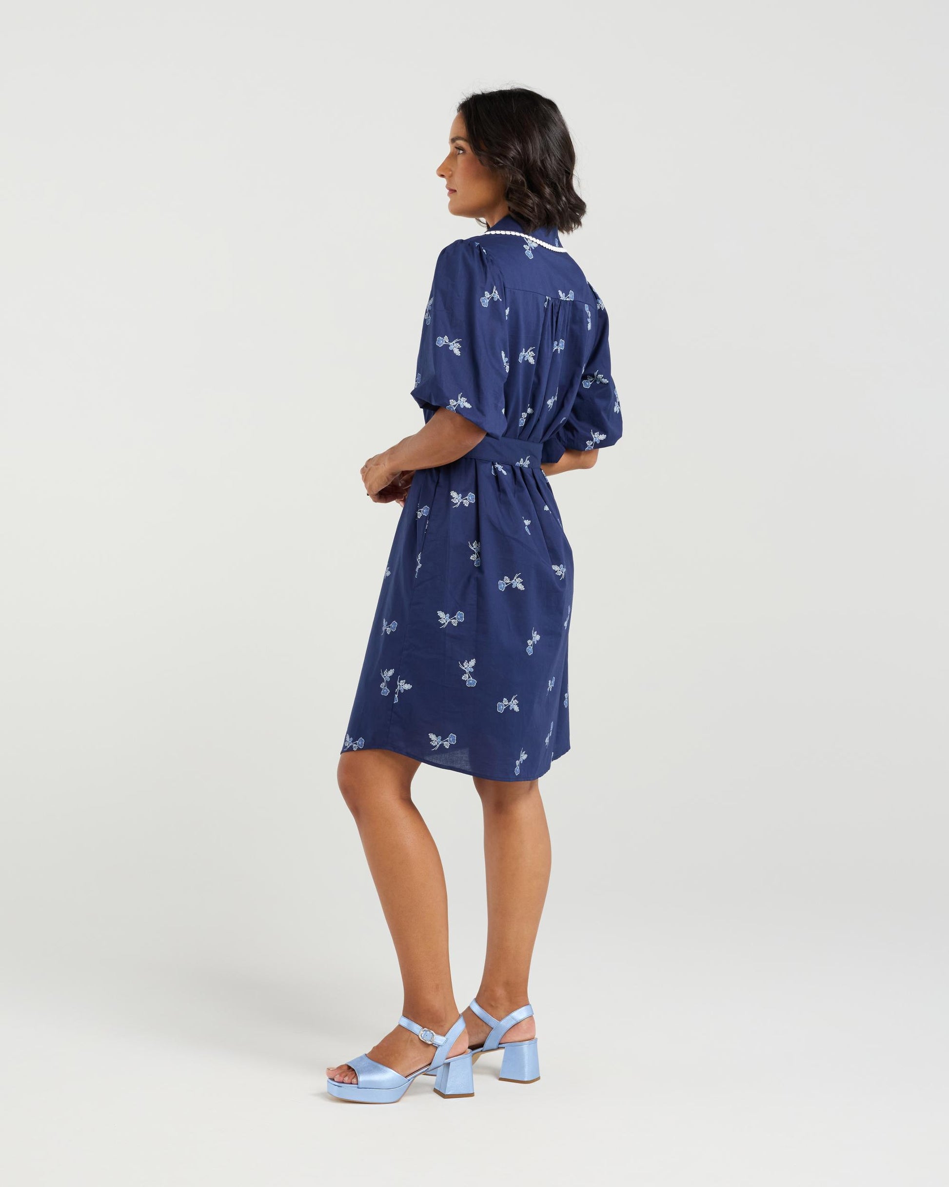 Emily, our short shirt dress is a flirty fusion of classic styling and feminine flair. The puffed sleeves add a touch of romance, while the self-covered belt cinches the waist, creating a flattering silhouette. With its button-down front and structured collar, this dress effortlessly transitions from day to night with a change of footwear and accessories.