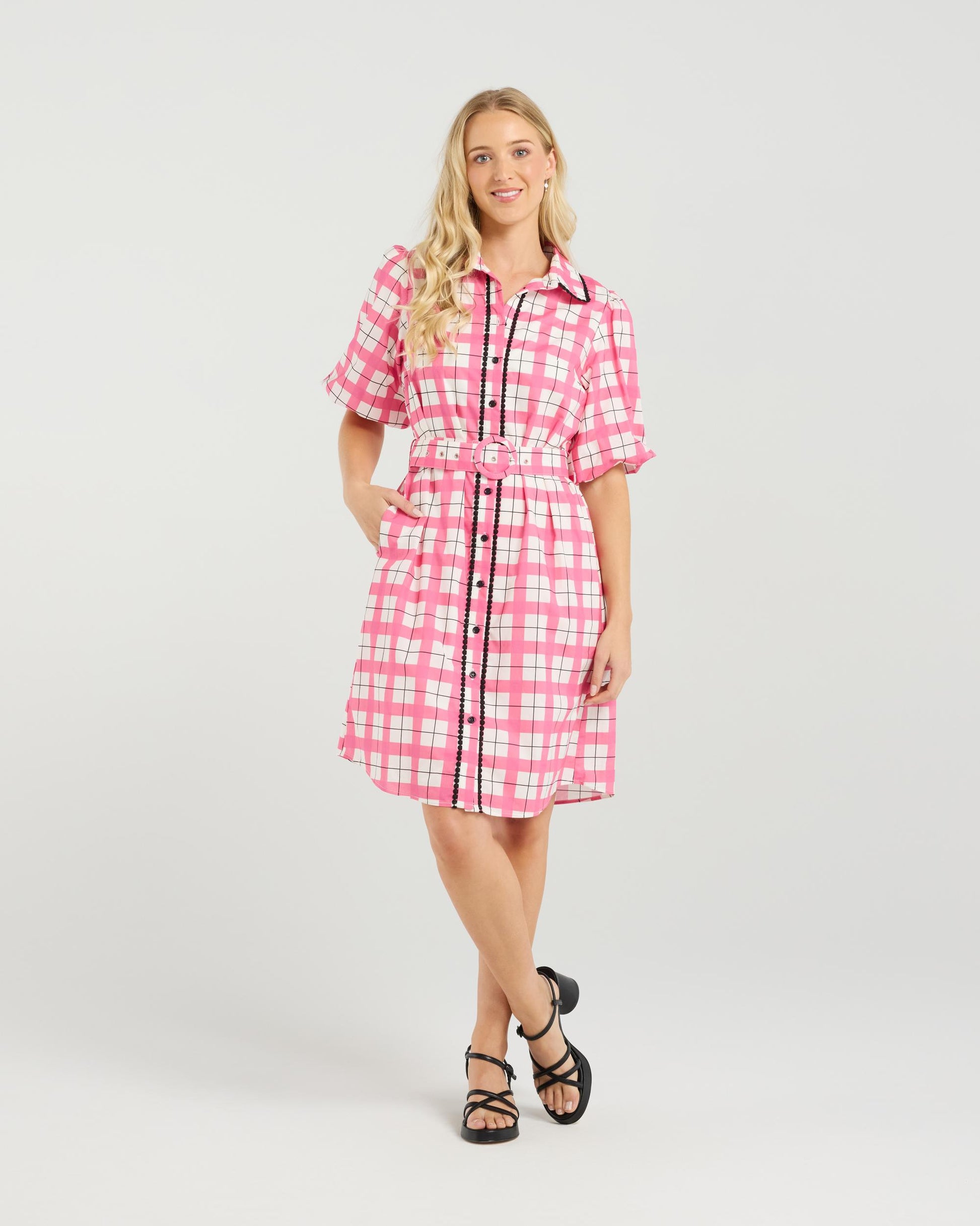 Emily, our short shirt dress is a flirty fusion of classic styling and feminine flair. The puffed sleeves add a touch of romance, while the self-covered belt cinches the waist, creating a flattering silhouette. With its button-down front and structured collar, this dress effortlessly transitions from day to night with a change of footwear and accessories.