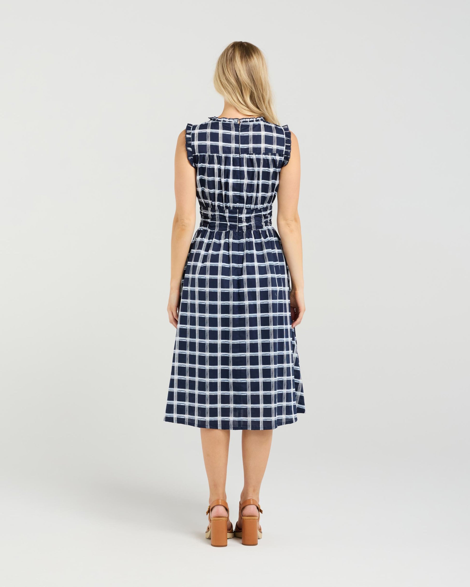 Romantic yet tailored, this sleeveless dress features a beautifully fitted bodice and a nipped-in waist that flows into a softly structured A-line skirt. Delicate frill detailing at the neckline and armholes adds a feminine touch, while piping detail at the waist highlights the more fitted silhouette. Perfect for this summer BBQ's with sandals or with a heel for a summer wedding.
