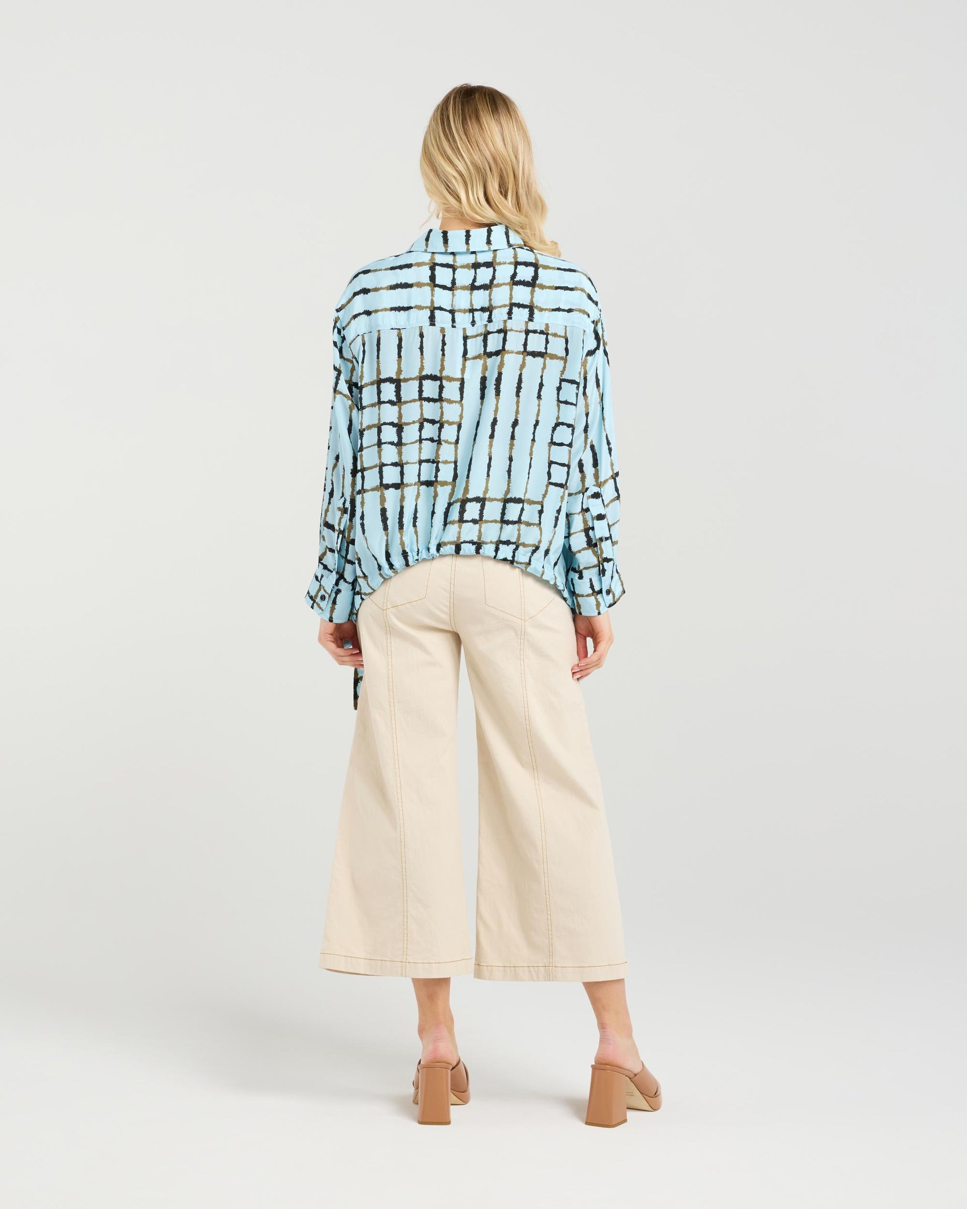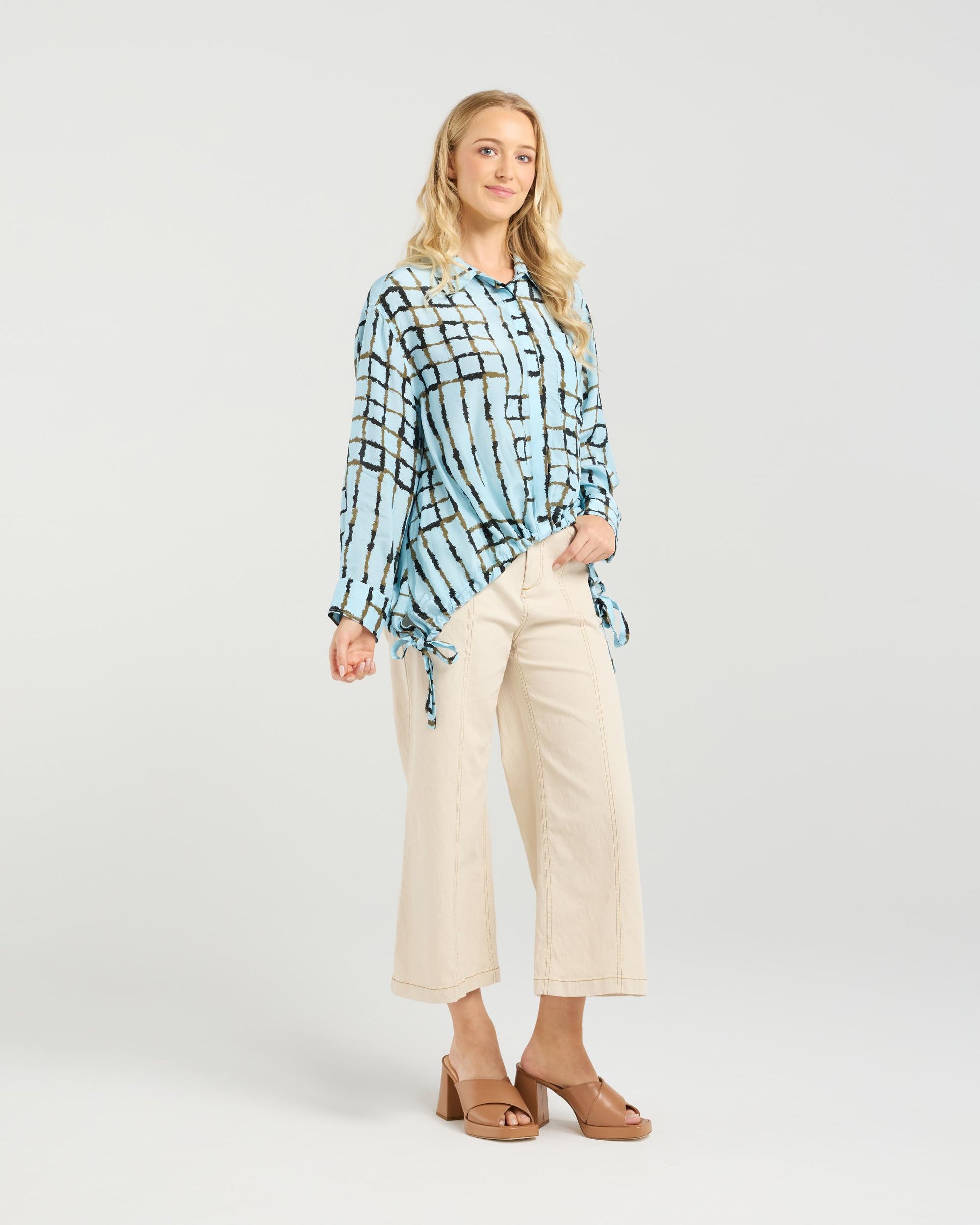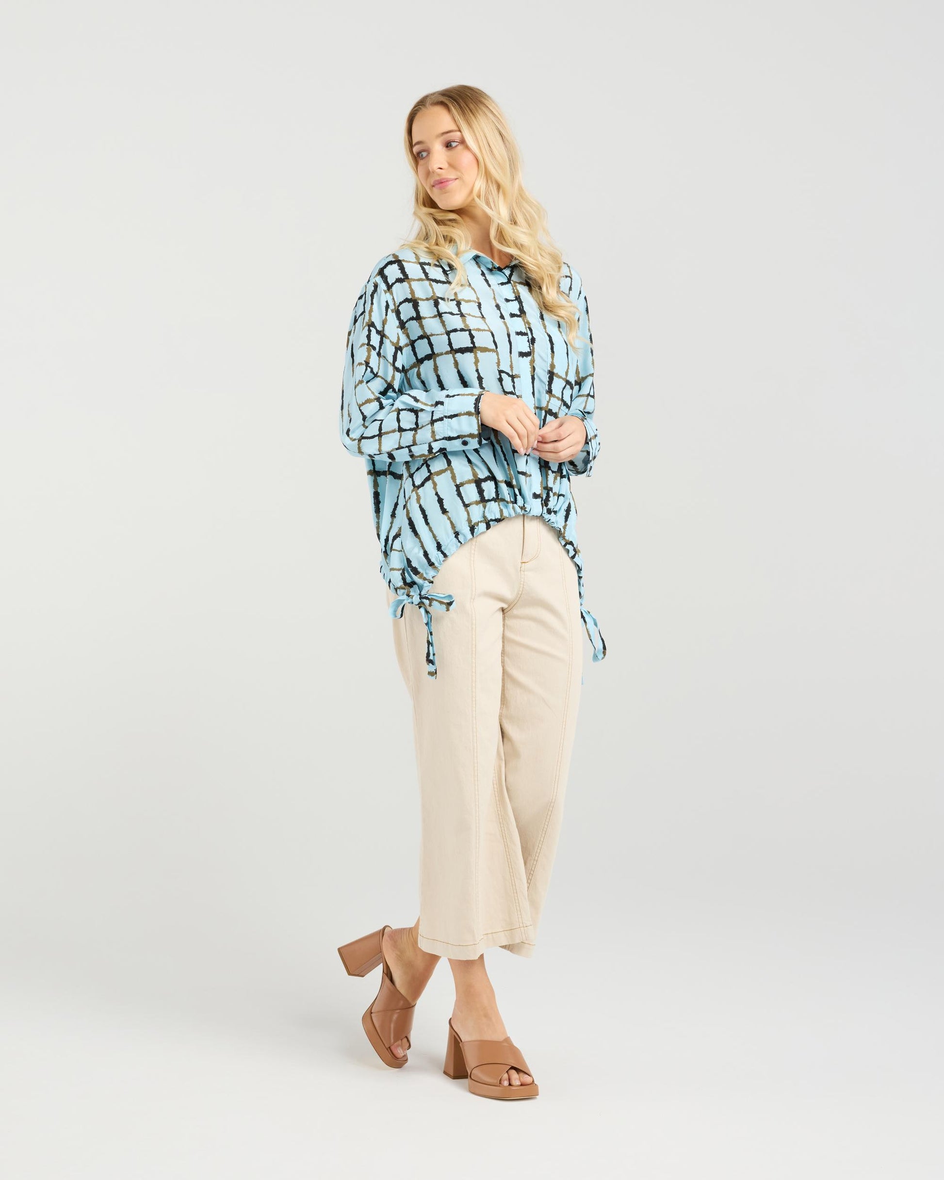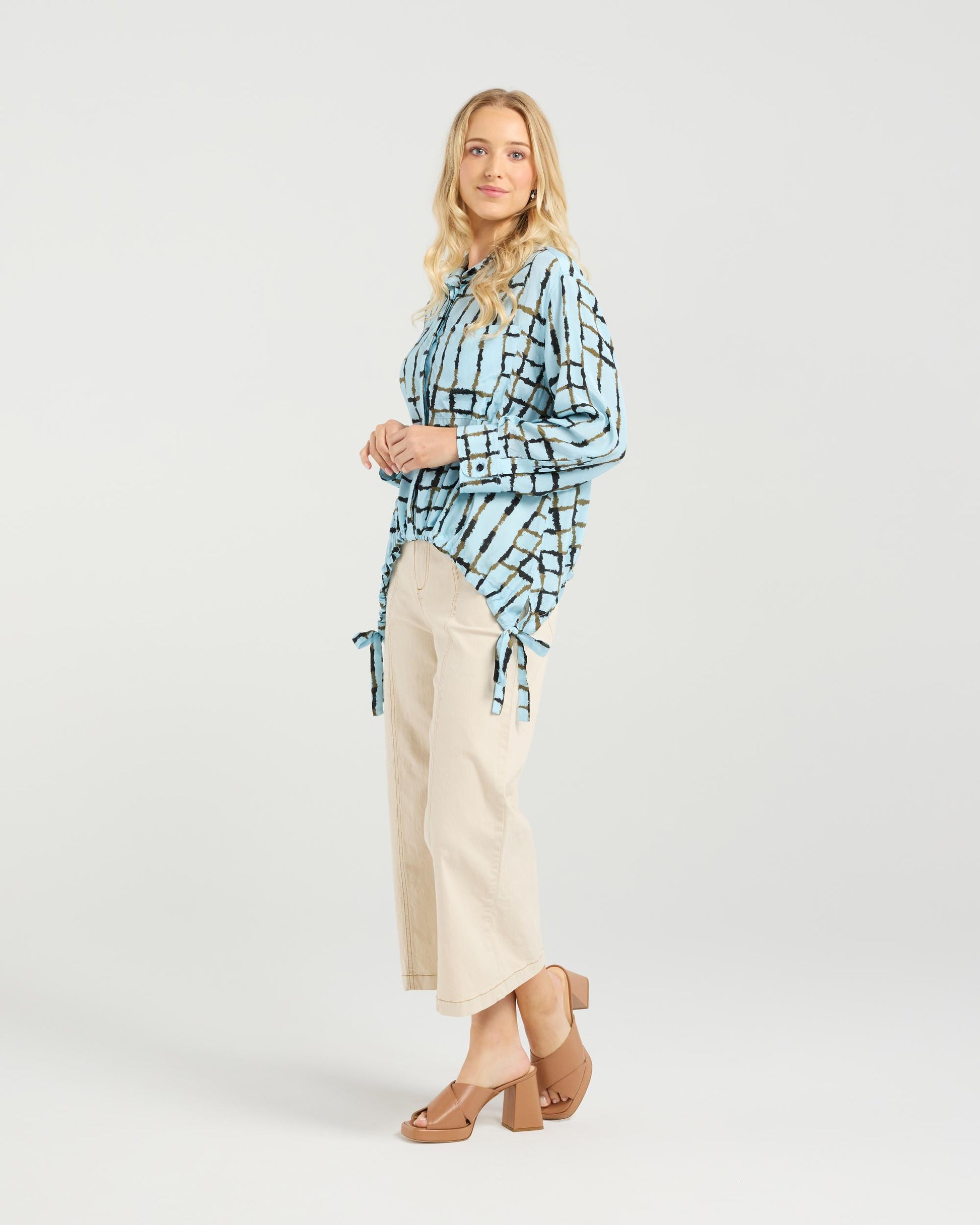 This versatile collared long-sleeved shirt features a button front, offering classic structure with a modern edge. Designed for comfort and style, the shirt includes drawstring ties at each side of the hem, allowing you to shape the silhouette to your preference—cinched for a more defined look or relaxed for casual wear. Perfect for layering or wearing on its own, this shirt blends timeless tailoring with an edgy detail.