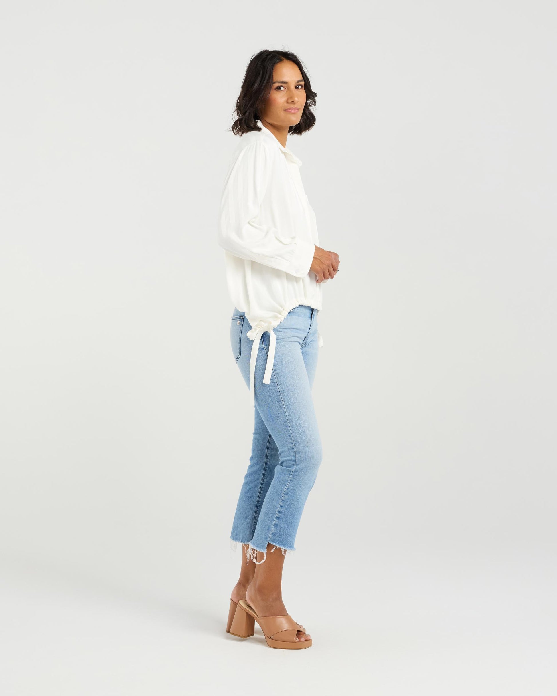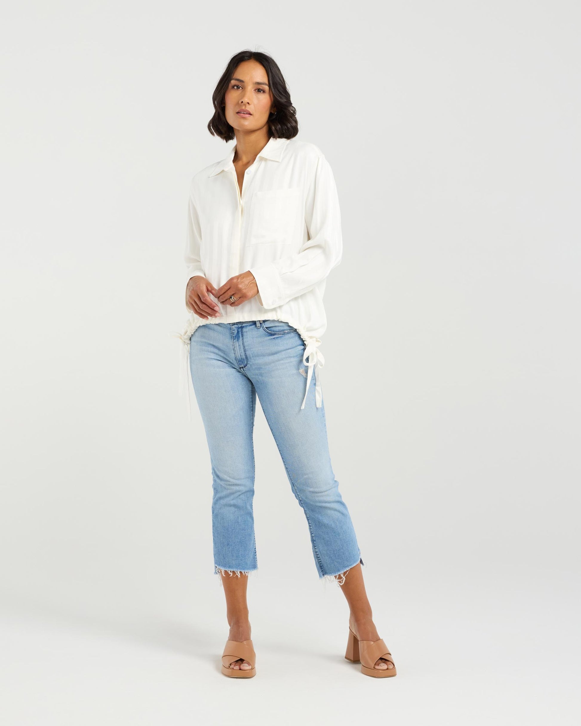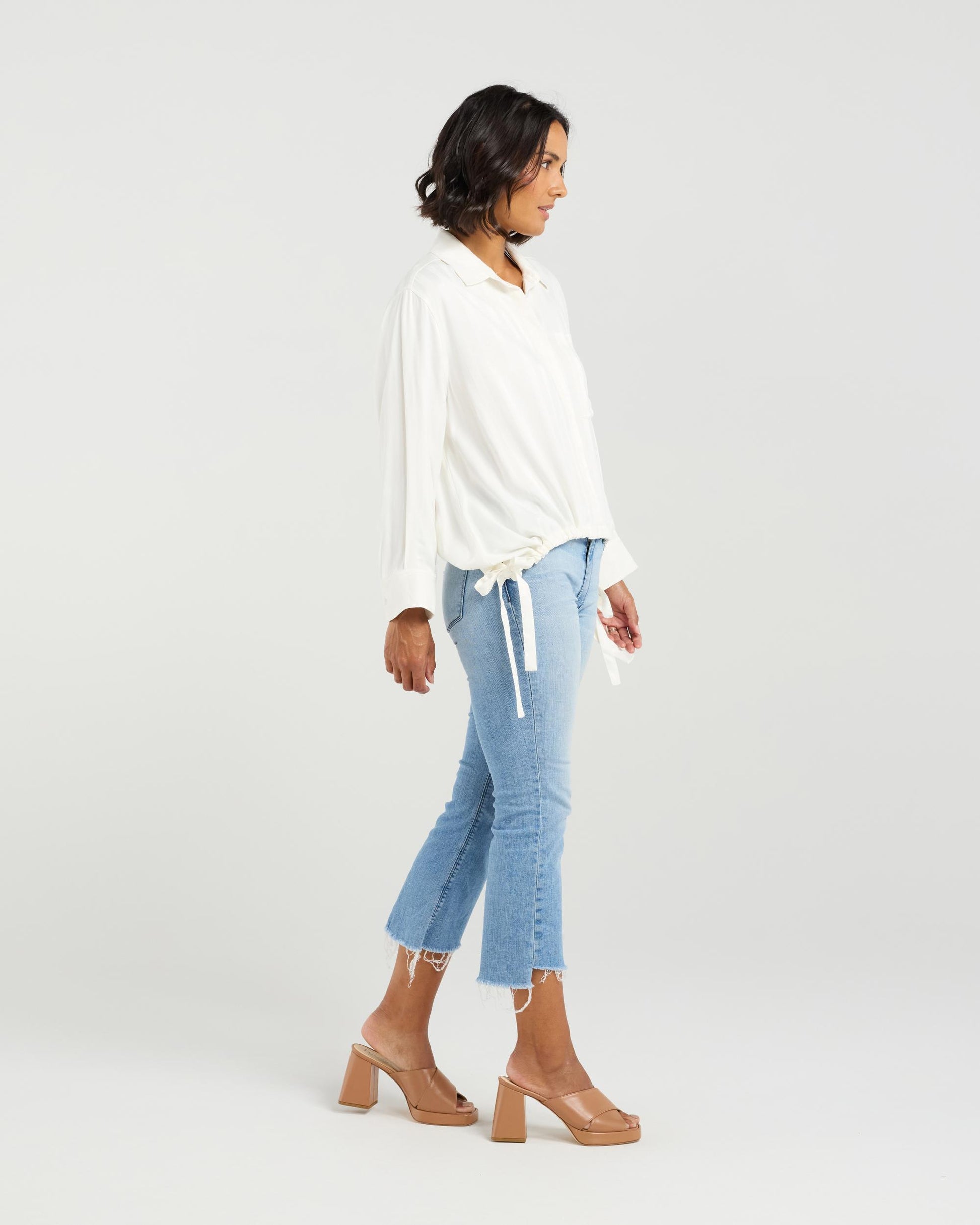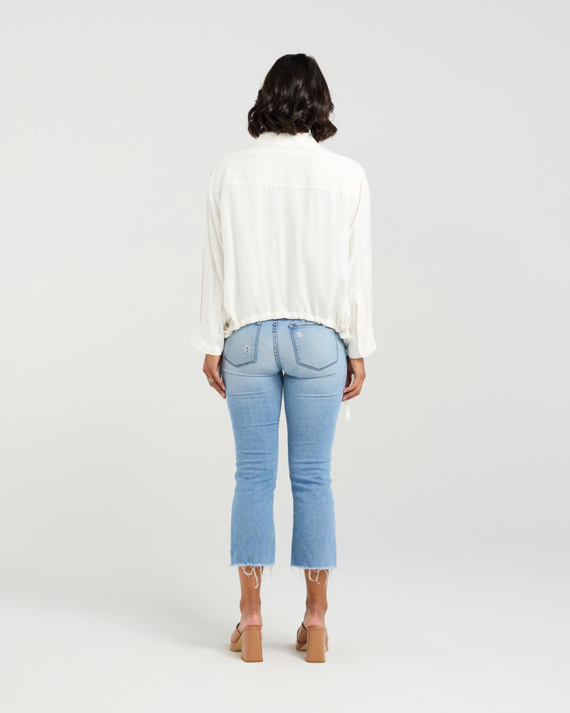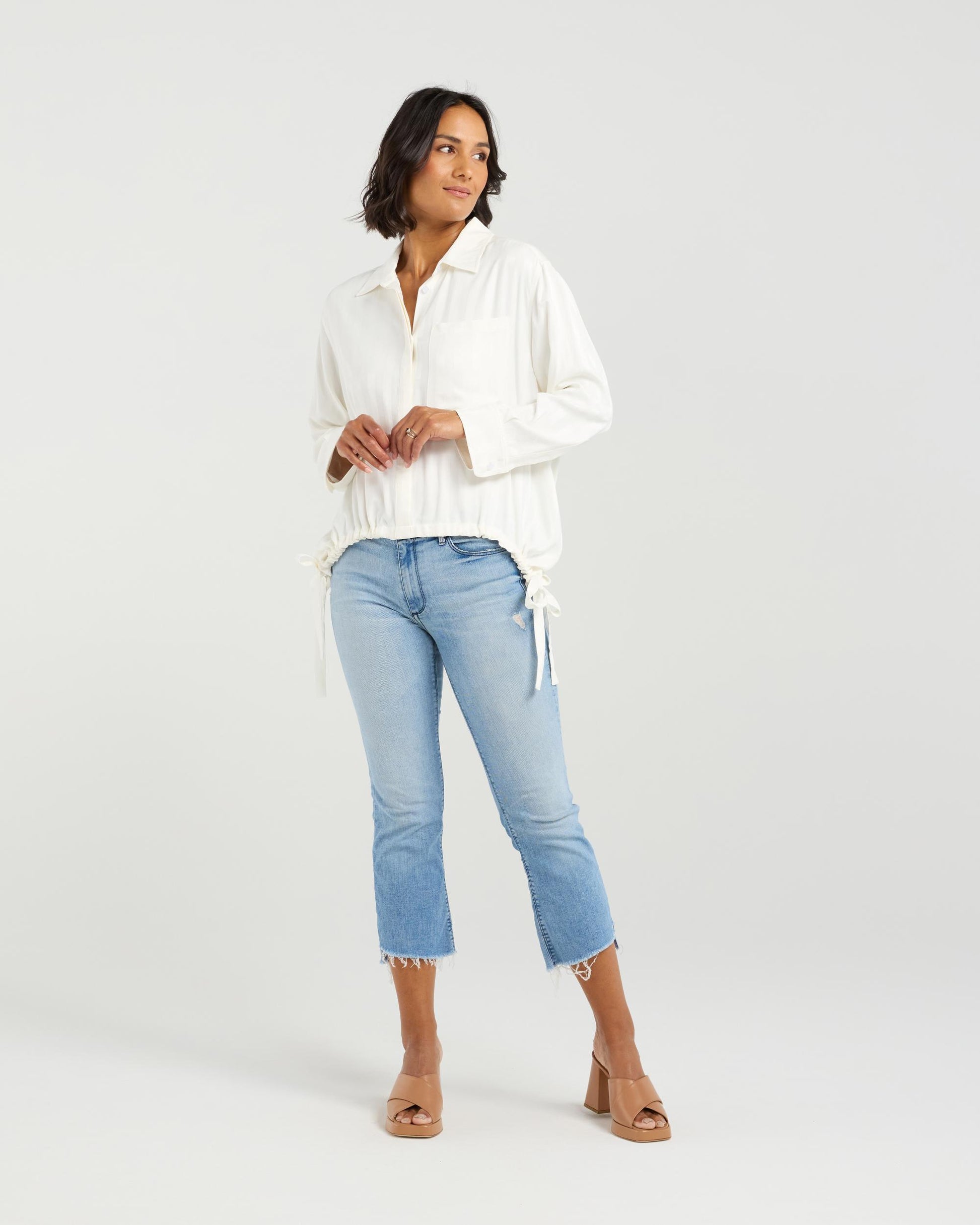This versatile collared long-sleeved shirt features a button front, offering classic structure with a modern edge. Designed for comfort and style, the shirt includes drawstring ties at each side of the hem, allowing you to shape the silhouette to your preference—cinched for a more defined look or relaxed for casual wear. Perfect for layering or wearing on its own, this shirt blends timeless tailoring with an edgy detail.