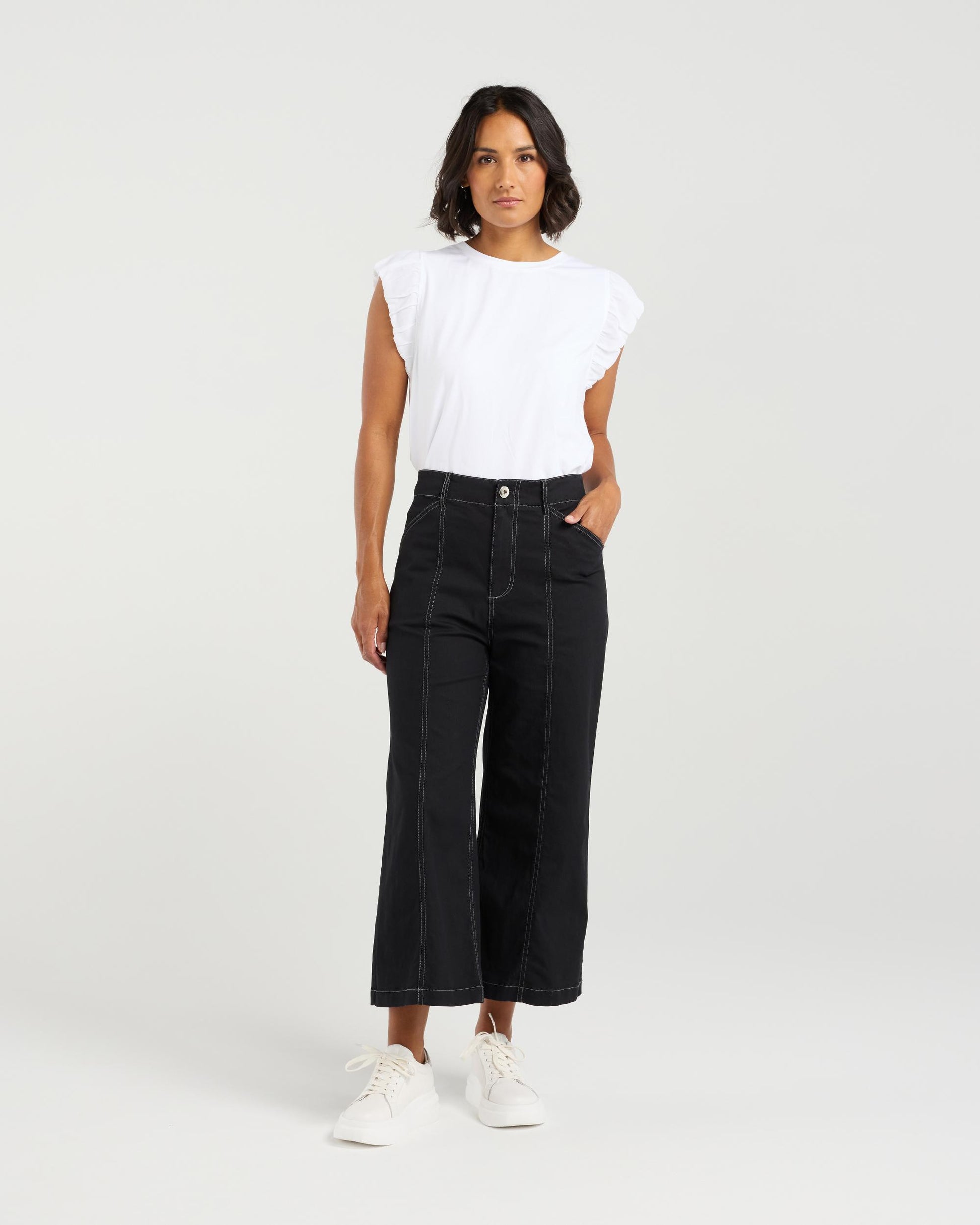 Meet your new non-denim denim crush: these 7/8th wider-legged pants bring major style with a laid-back attitude. Crafted from cotton spandex blend, they feature contrast stitching for that finishing touch. The cropped length shows off your shoes, while the wide leg keeps things effortlessly chic. Perfect for dressing up or kicking back!