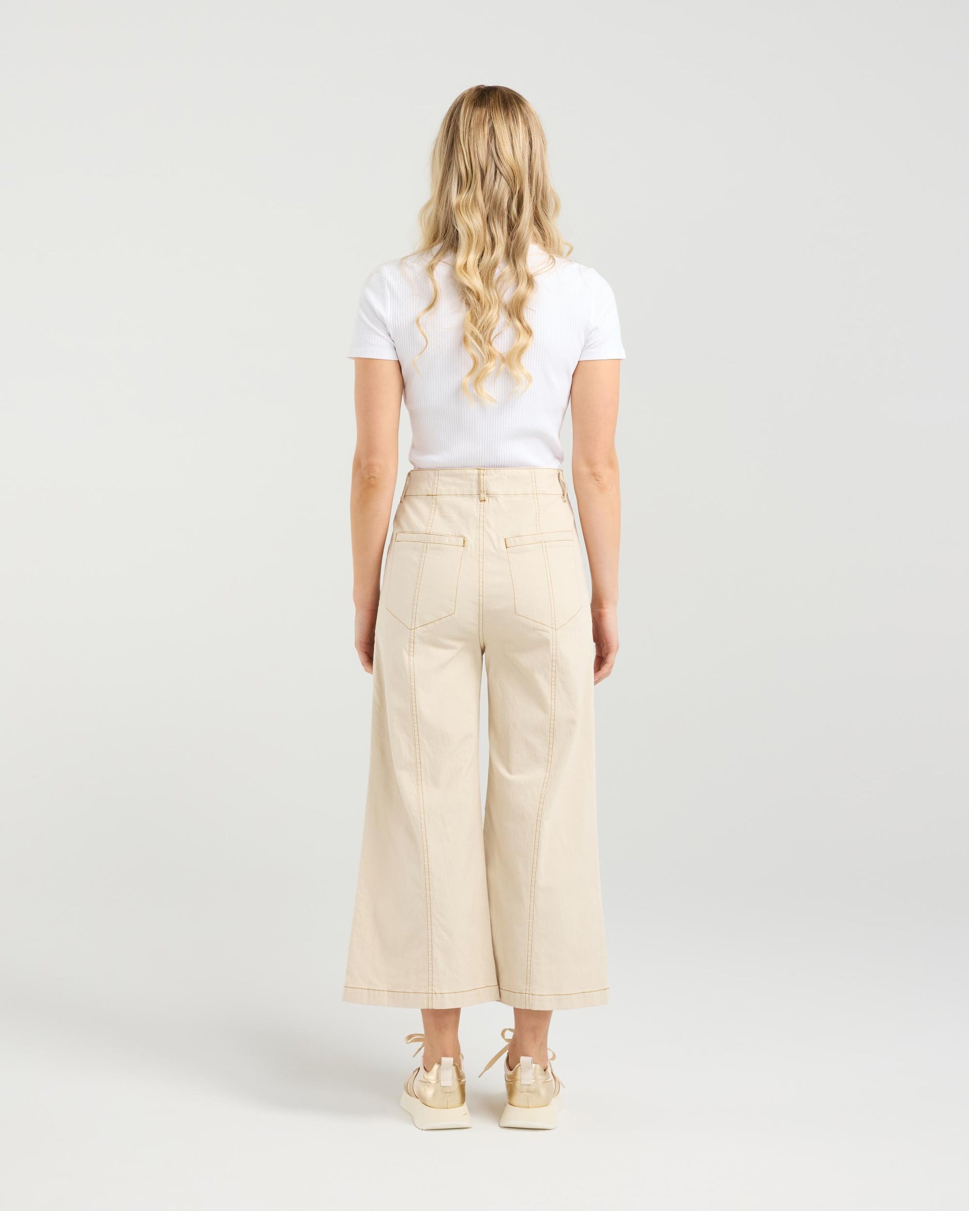 Meet your new non-denim denim crush: these 7/8th wider-legged pants bring major style with a laid-back attitude. Crafted from cotton spandex blend, they feature contrast stitching for that finishing touch. The cropped length shows off your shoes, while the wide leg keeps things effortlessly chic. Perfect for dressing up or kicking back!