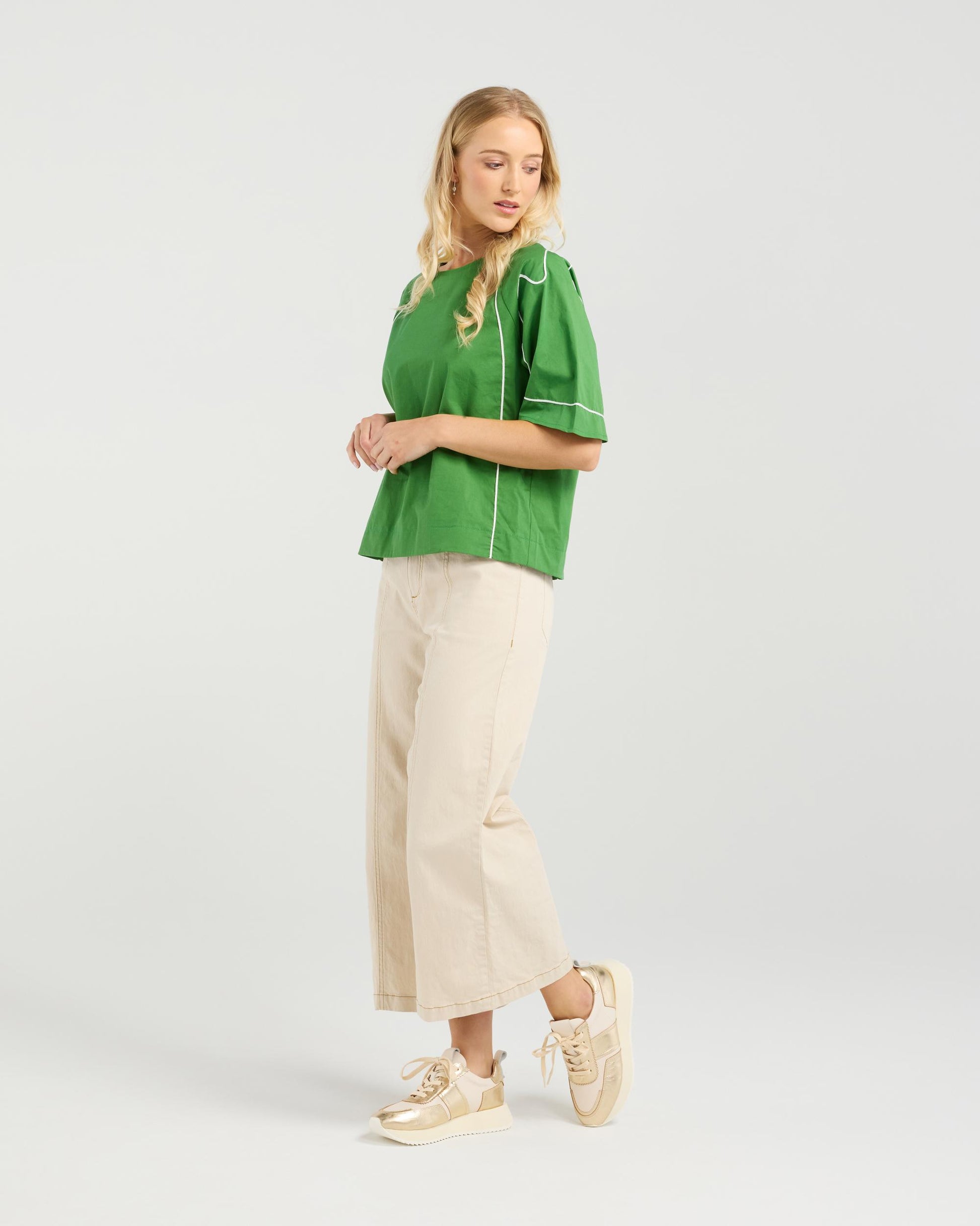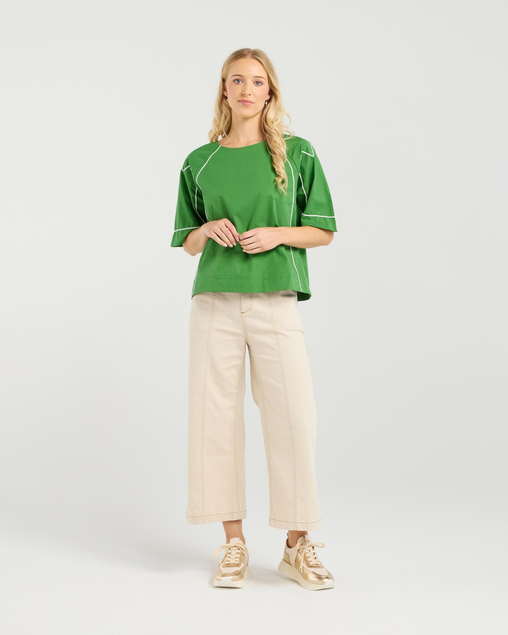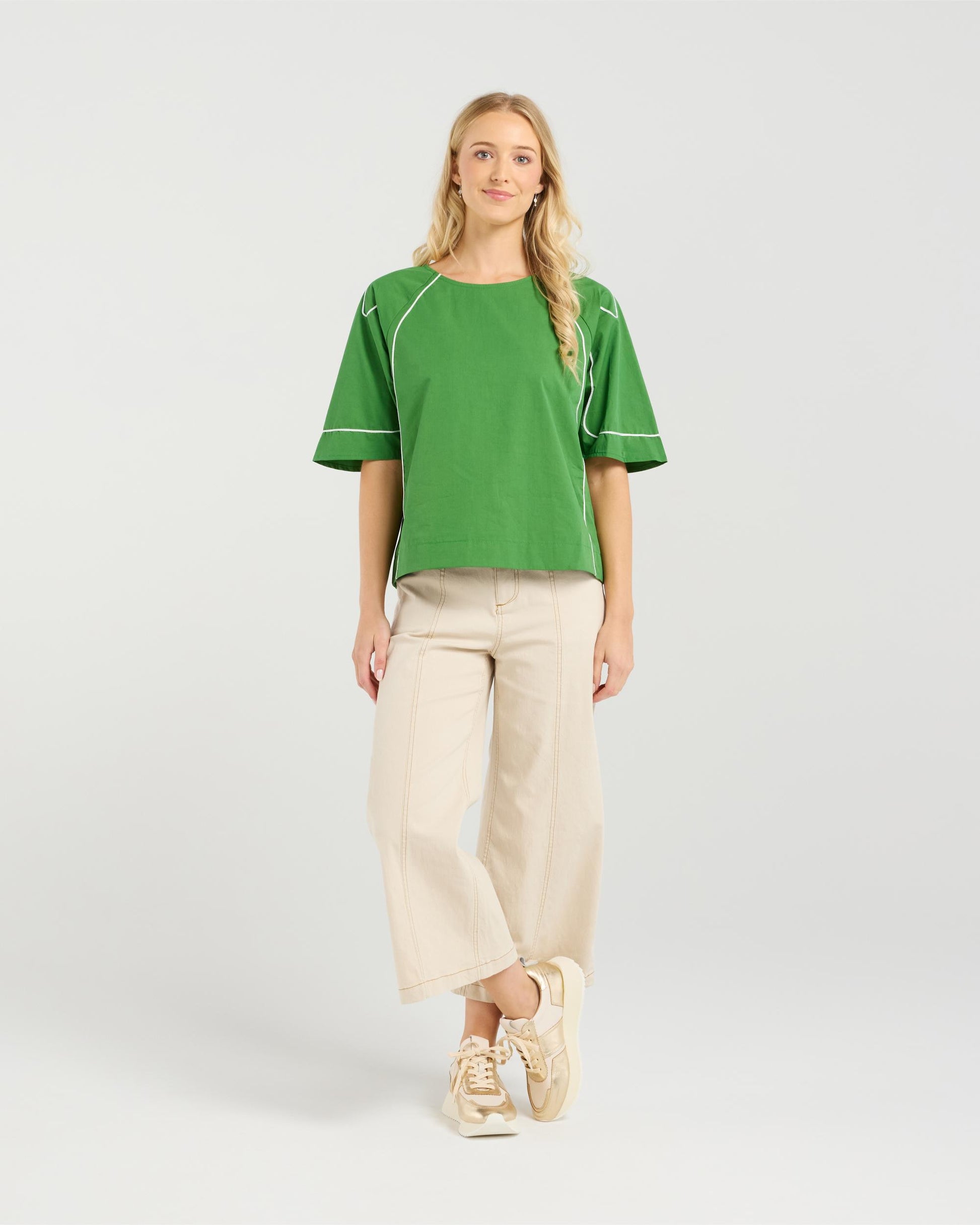 A contemporary take on the classic shell top, this short-sleeved style blends clean lines with subtle fashion detailing. Cut from crisp cotton for a lightweight yet structured feel, it features a not-quite-tee silhouette—streamlined and elevated. Contrast tape accents add a refined edge, offering a directional finish that makes this a wardrobe must have.