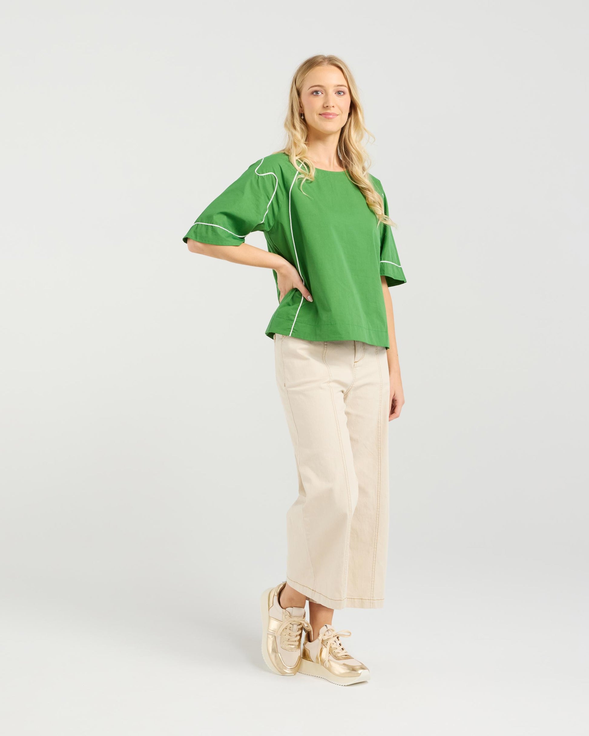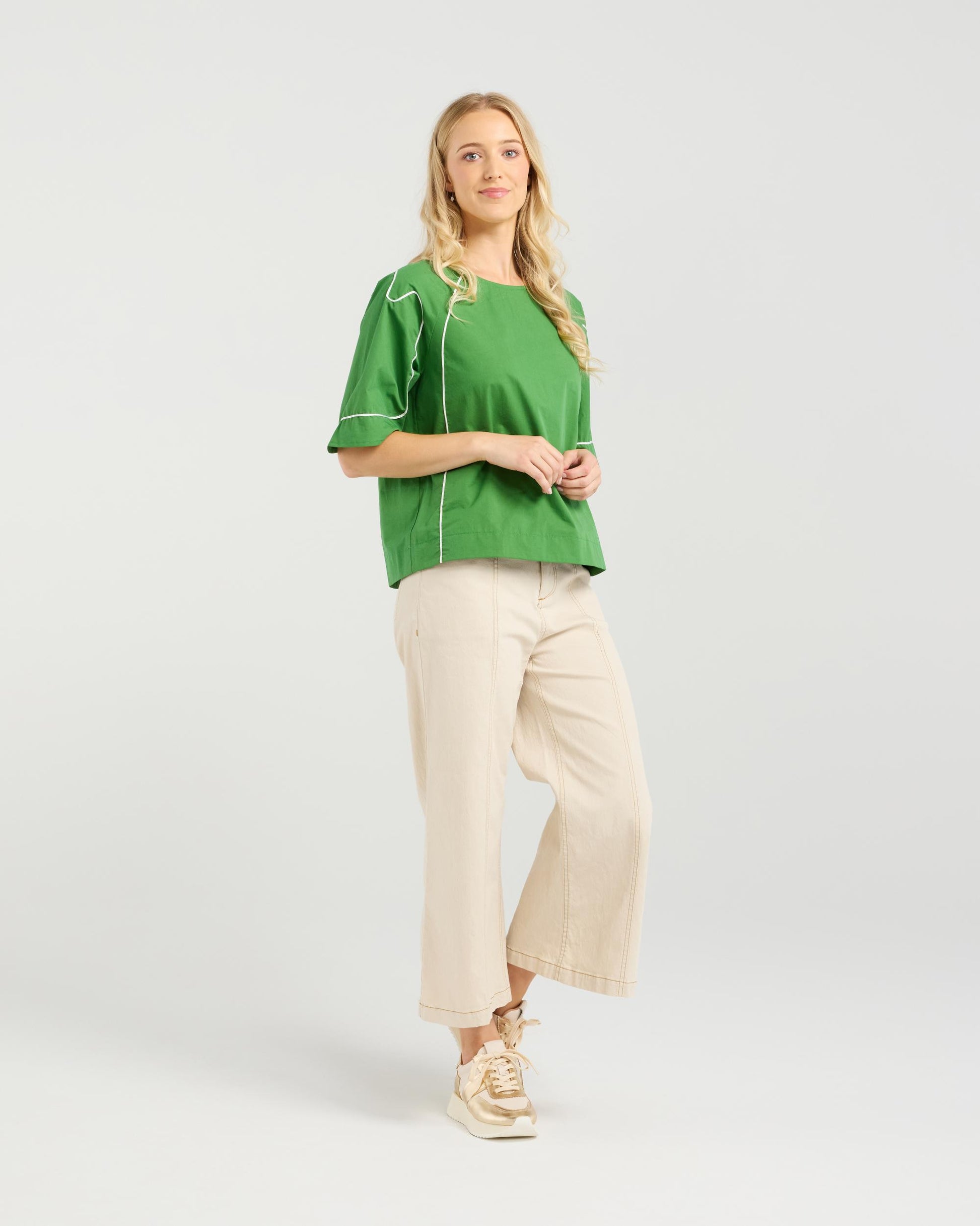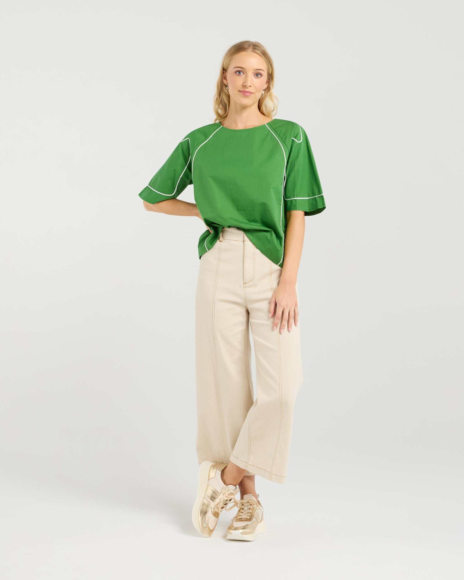 A contemporary take on the classic shell top, this short-sleeved style blends clean lines with subtle fashion detailing. Cut from crisp cotton for a lightweight yet structured feel, it features a not-quite-tee silhouette—streamlined and elevated. Contrast tape accents add a refined edge, offering a directional finish that makes this a wardrobe must have.
