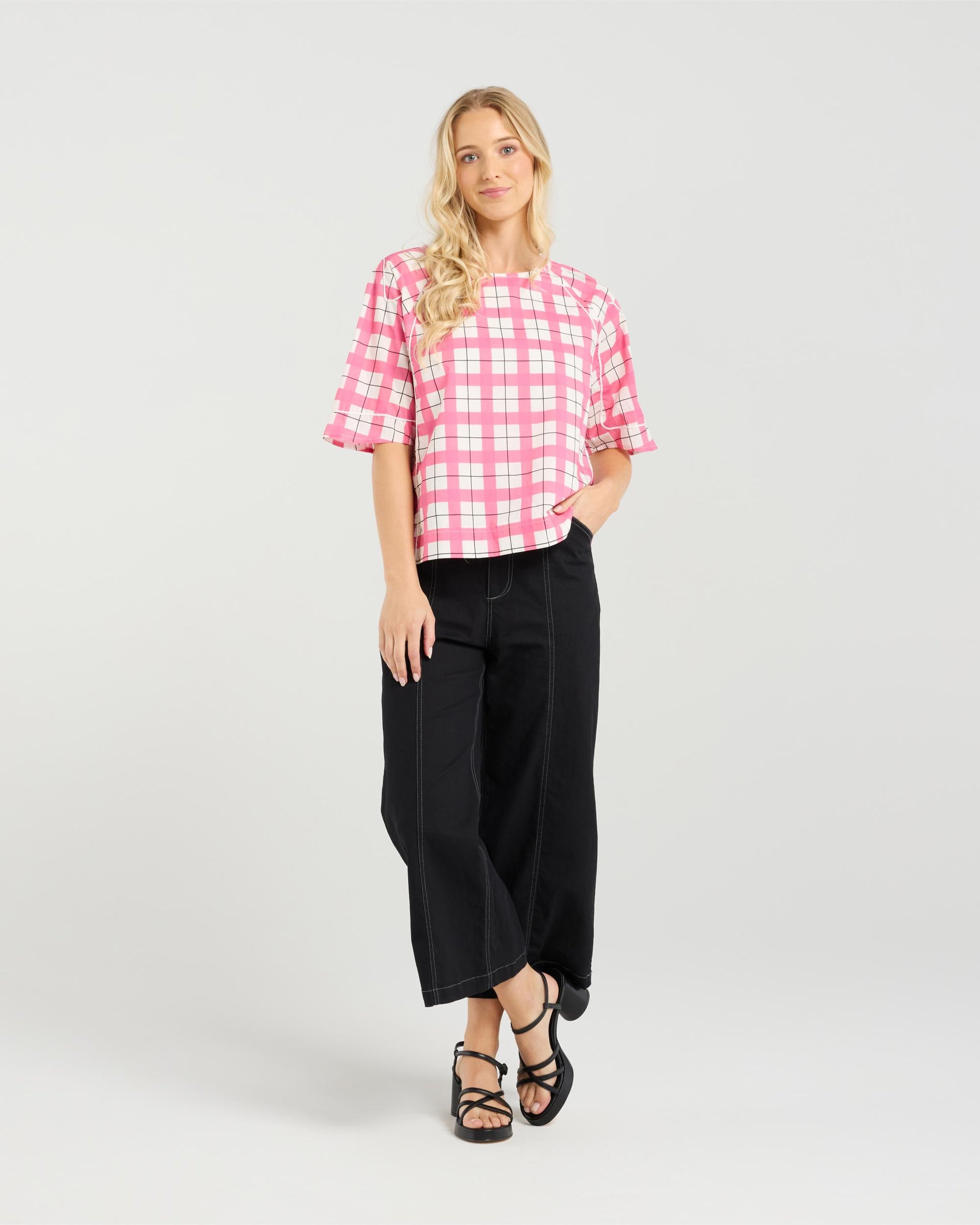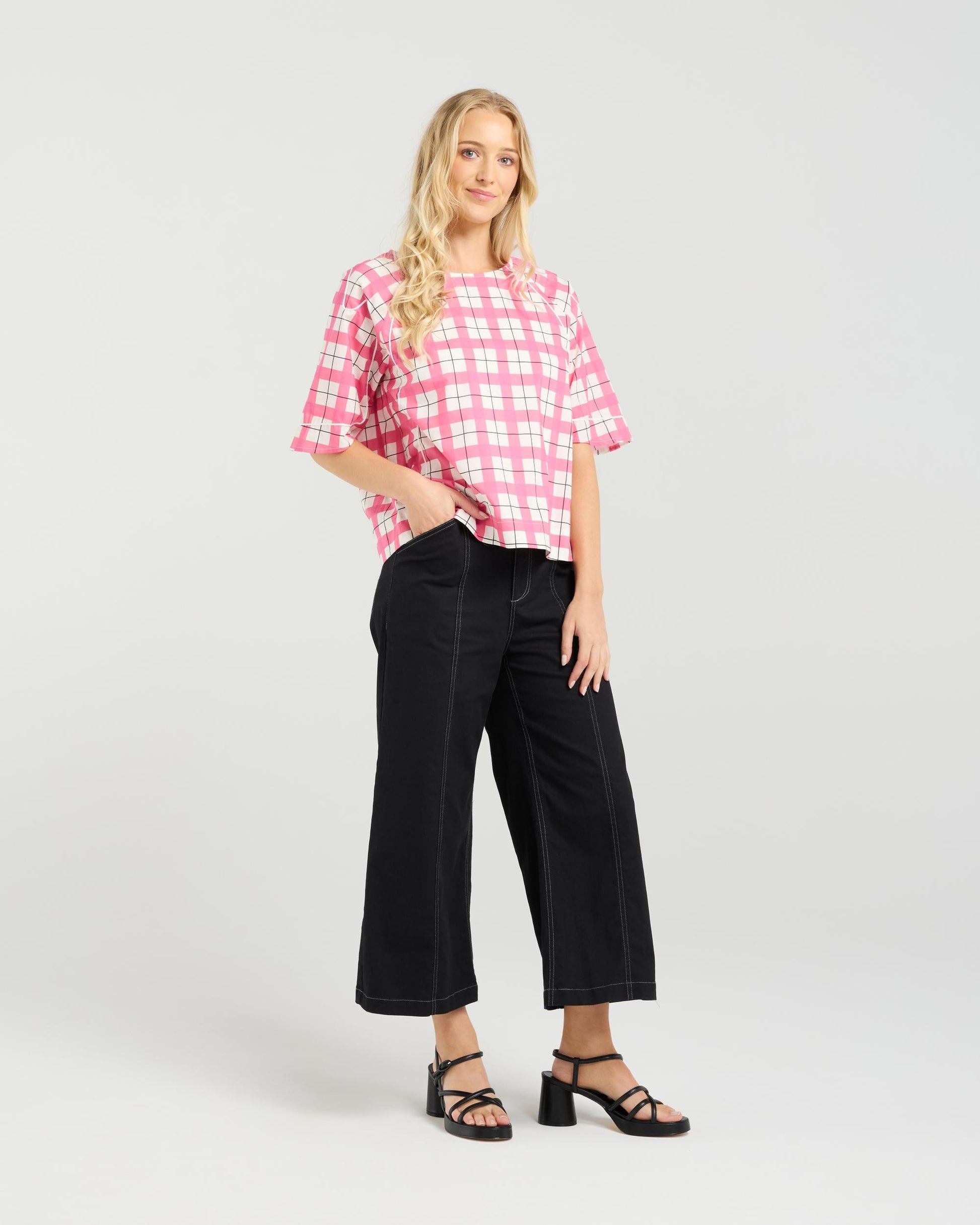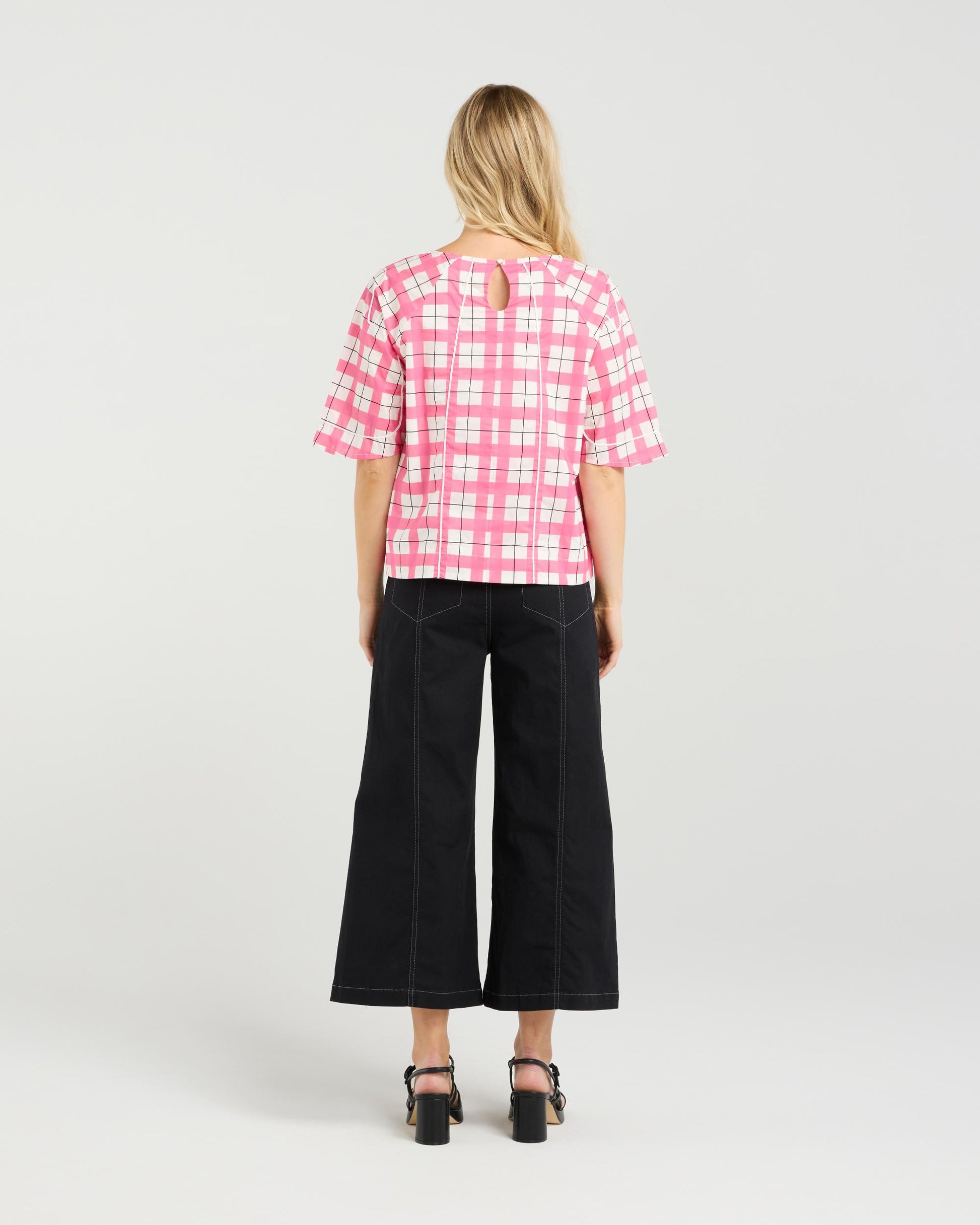 A contemporary take on the classic shell top, this short-sleeved style blends clean lines with subtle fashion detailing. Cut from crisp cotton for a lightweight yet structured feel, it features a not-quite-tee silhouette—streamlined and elevated. Contrast tape accents add a refined edge, offering a directional finish that makes this a wardrobe must have.
