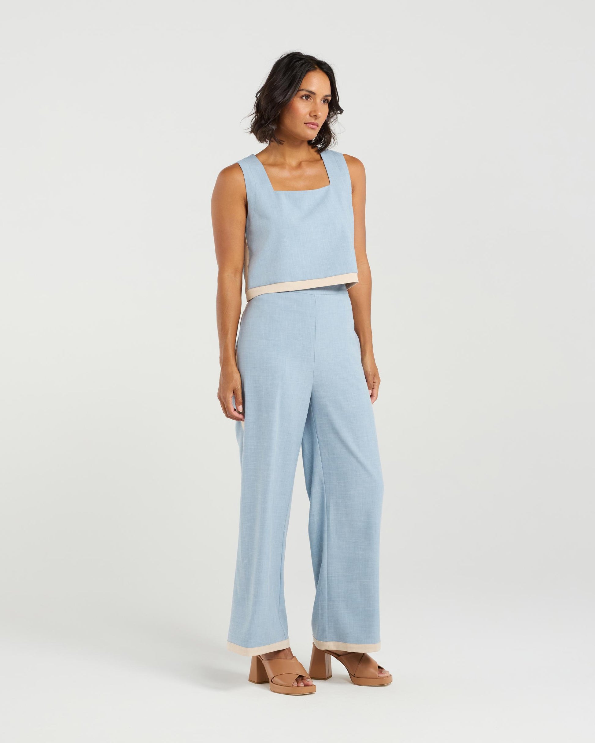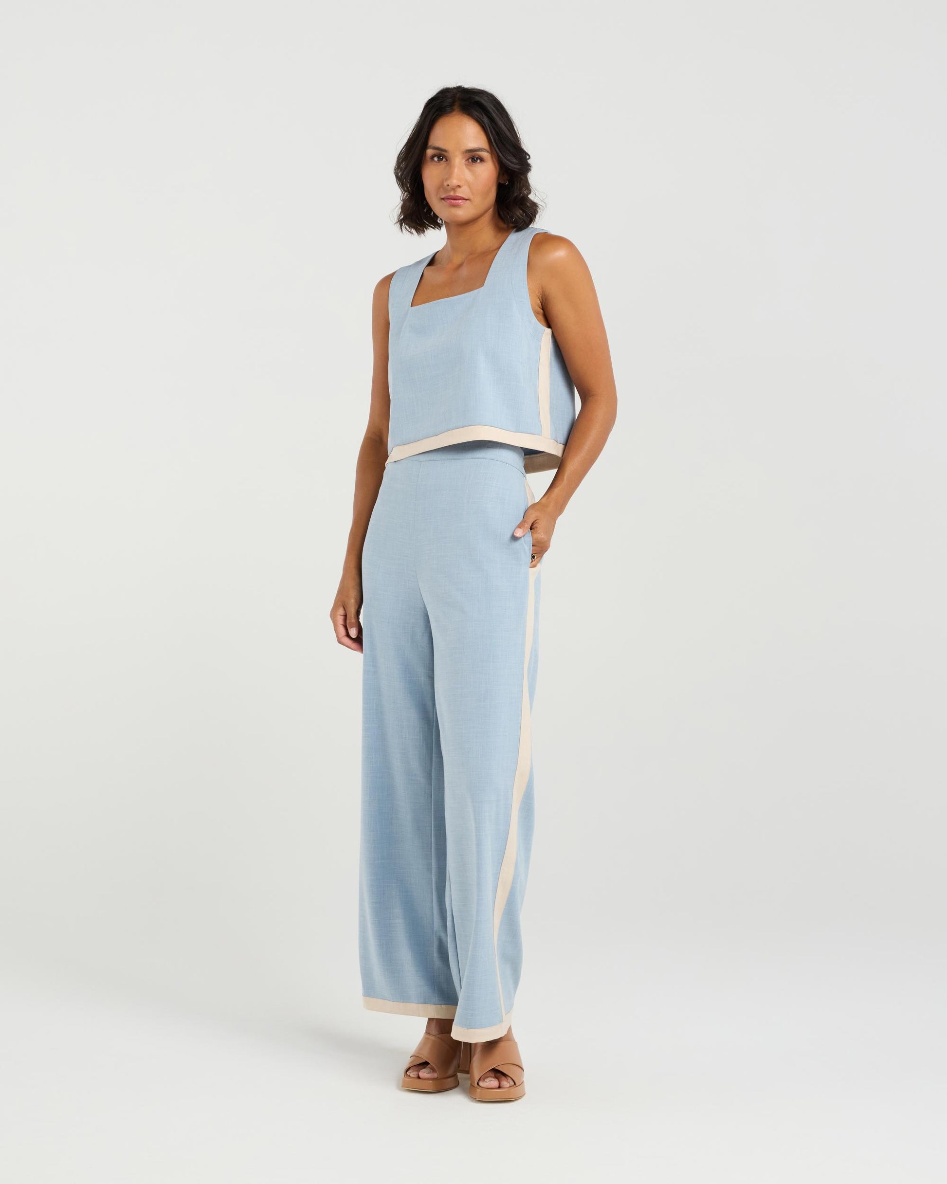 Clean lines meet bold contrast in this sleeveless crop top. Featuring a square neckline and standout side panels, it’s definitely a must have statement piece. Fitted just right and cropped to flatter, it’s perfect for pairing with high-waisted anything— or with the matching Priscilla pant for the ultimate summer outfit.