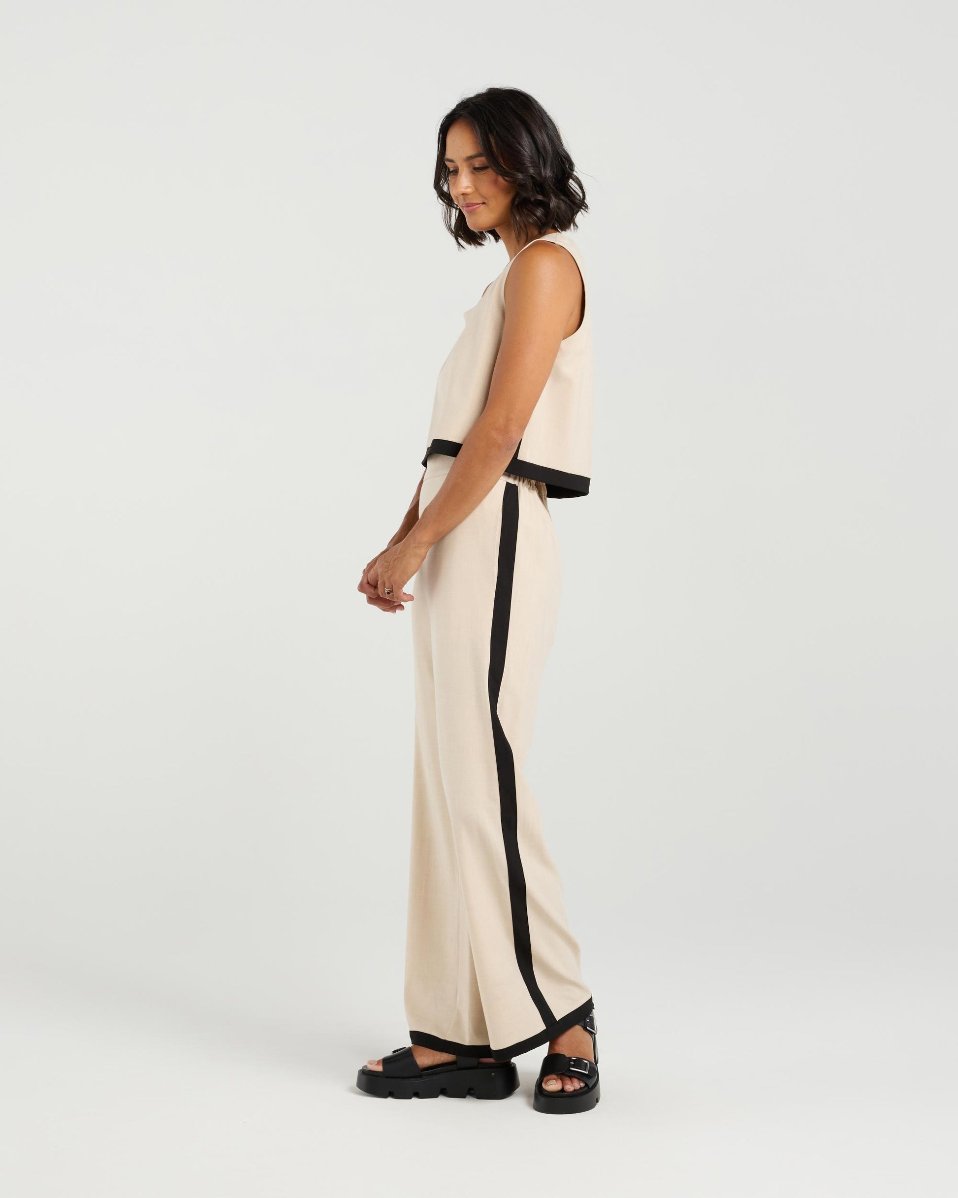 Effortlessly chic and endlessly wearable, these wide-leg pants feature a flat front waistband for a sleek silhouette, while an elasticated back ensures all-day comfort. Designed with functional pockets and a bold contrasting side panel, they strike the perfect balance between relaxed ease and directional style. Ideal for dressing up or down with ease. Style with the matching Priscilla Crop for the perfect outfit for all those summer occasions.