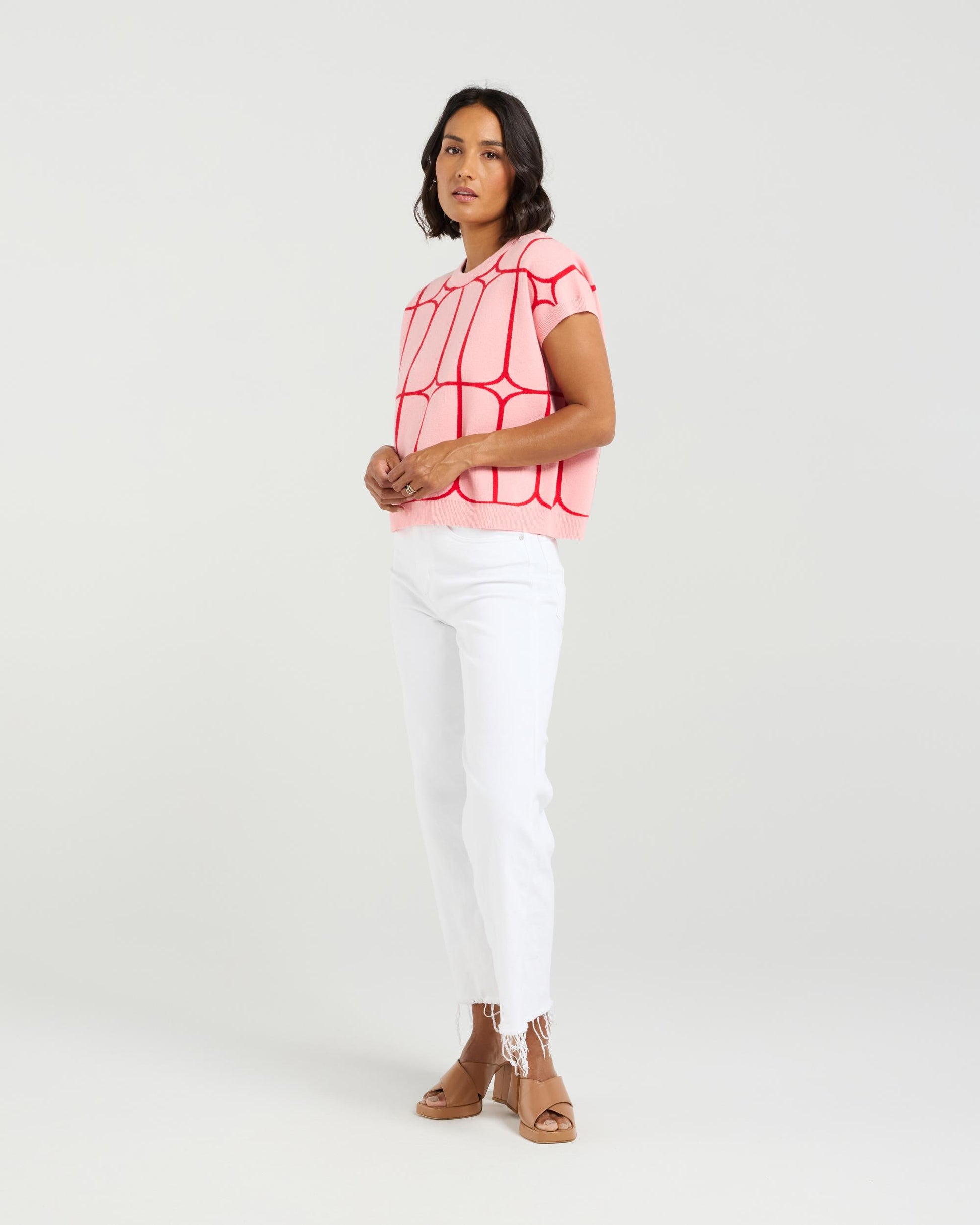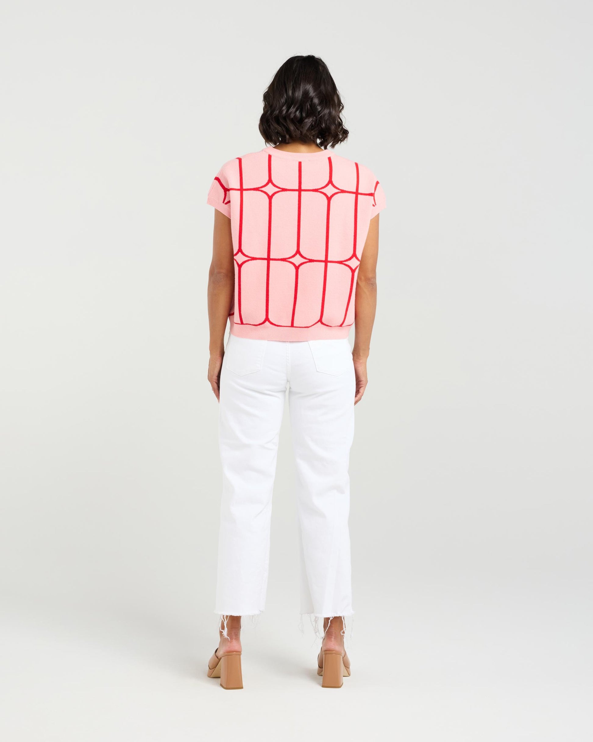Effortlessly refined, this summer-ready knit vest is a warm-weather essential with a modern twist. Crafted in a soft knit, it features a striking contrast trellis pattern that adds graphic dimension and texture. Perfect for layering over a crisp shirt or styling solo with tailored shorts, this vest balances structure and softness for a polished yet relaxed look.