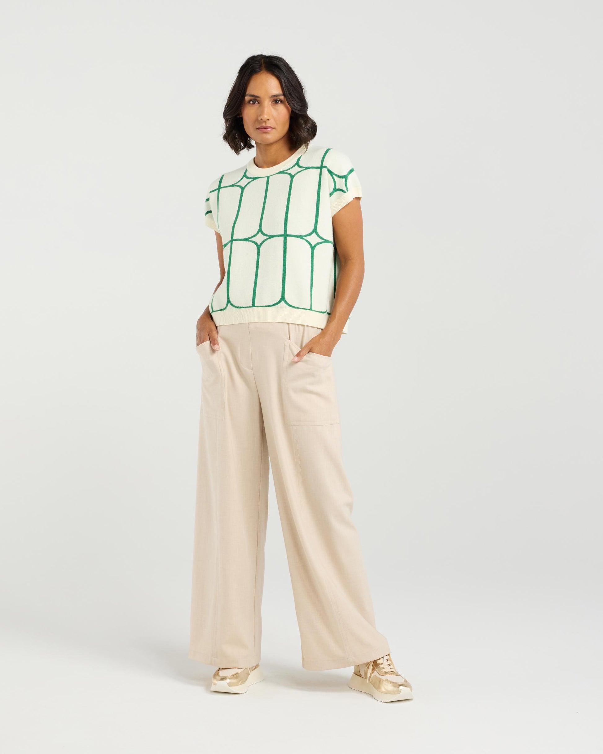 Effortlessly refined, this summer-ready knit vest is a warm-weather essential with a modern twist. Crafted in a soft knit, it features a striking contrast trellis pattern that adds graphic dimension and texture. Perfect for layering over a crisp shirt or styling solo with tailored shorts, this vest balances structure and softness for a polished yet relaxed look.