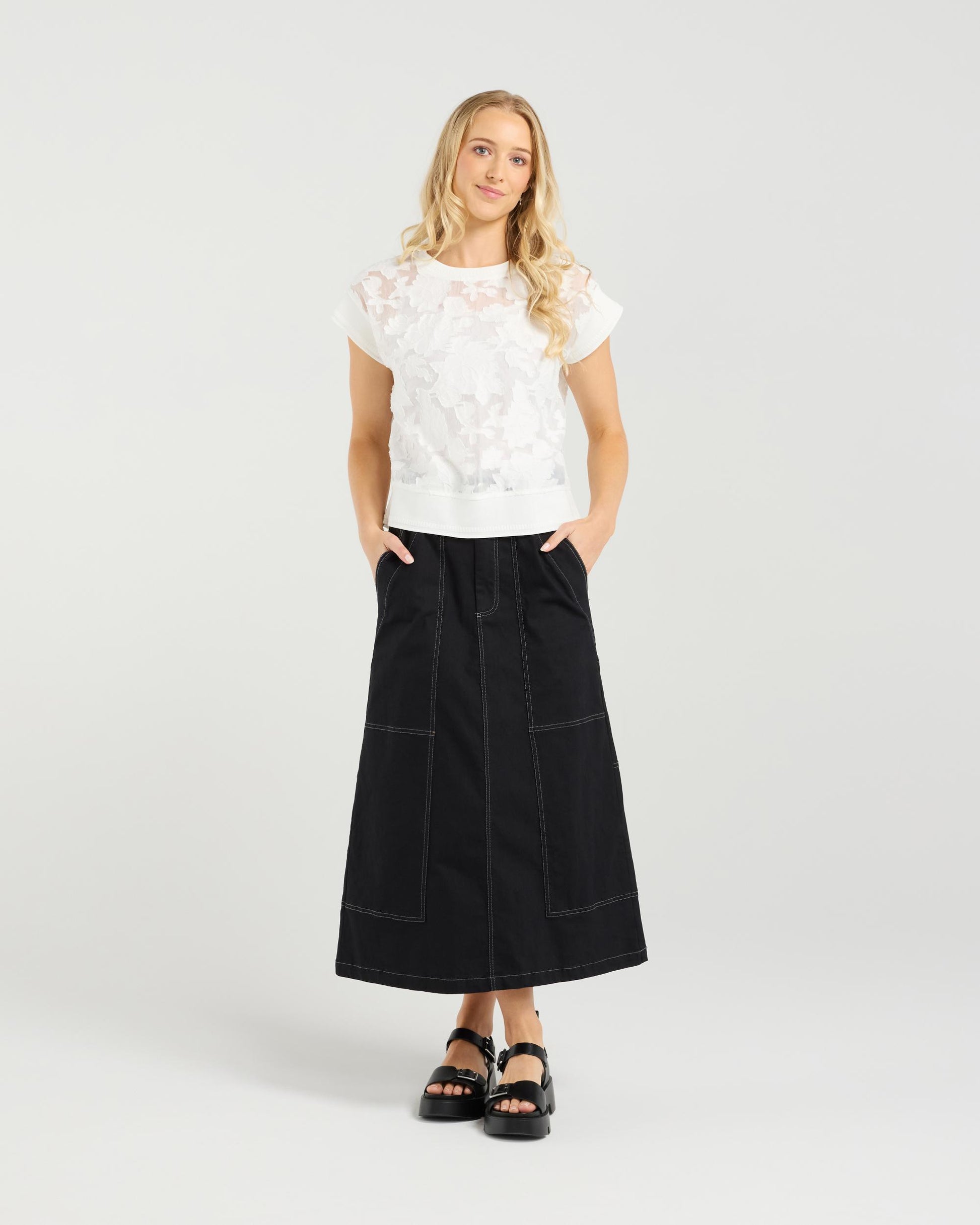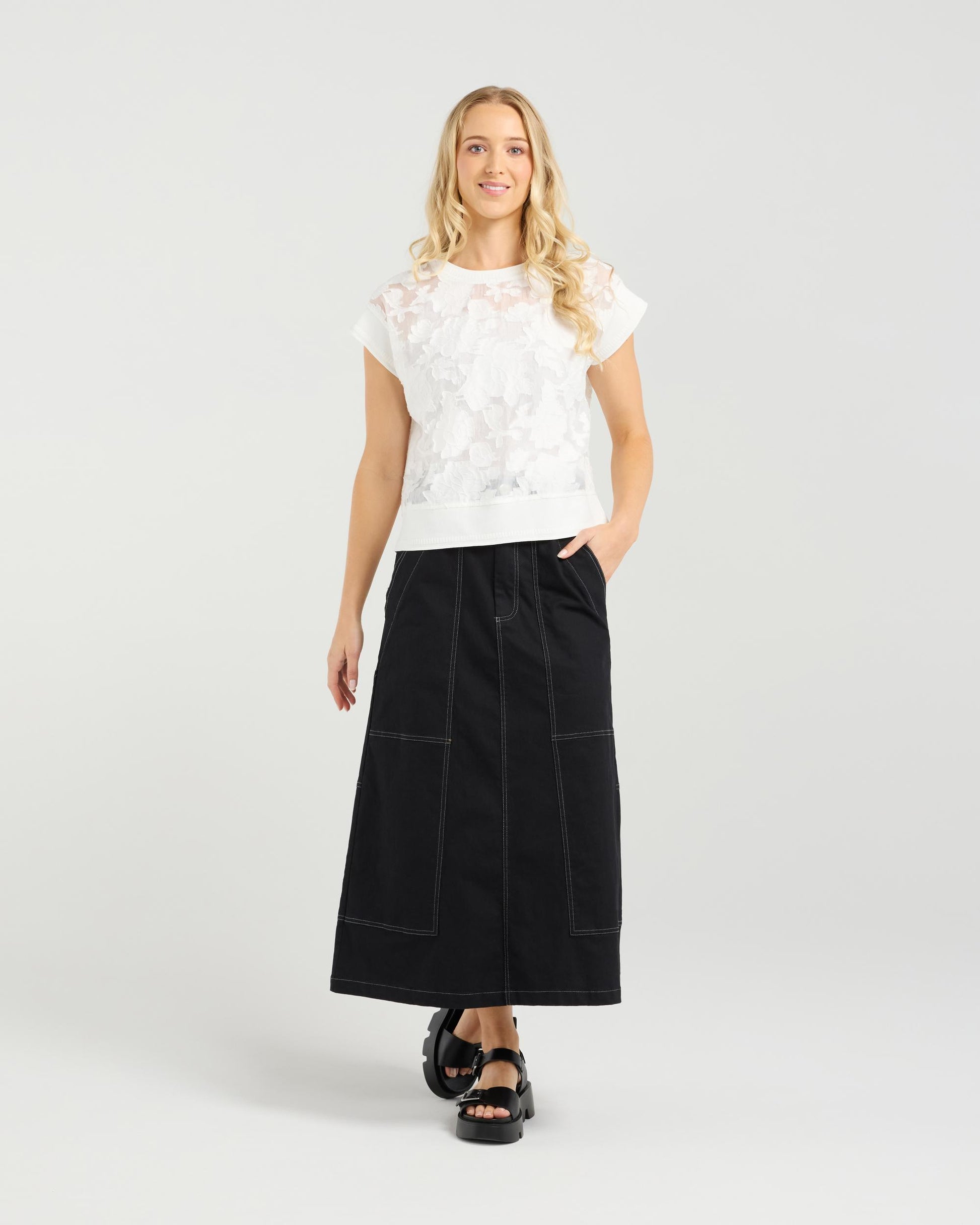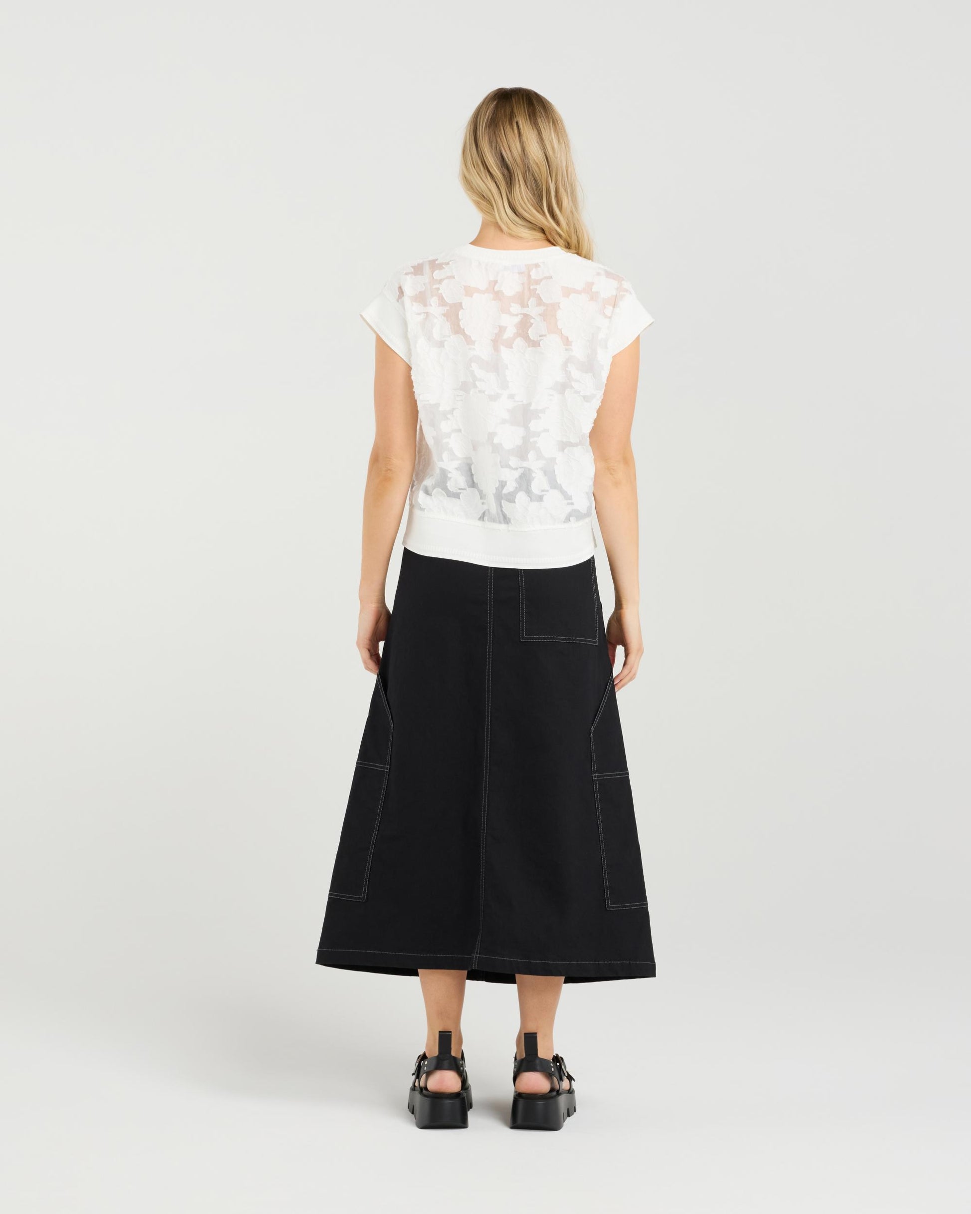 A refined take on a wardrobe essential, this elevated tee is crafted from a gorgeous burnout fabric that offers a soft, semi-sheer texture with subtle depth. Designed for effortless sophistication, it's finished with ribbing at the neckline and cuffs—adding structure and contrast to the relaxed silhouette. Equally suited for layering or standalone wear, this piece brings understated elegance to everyday dressing.