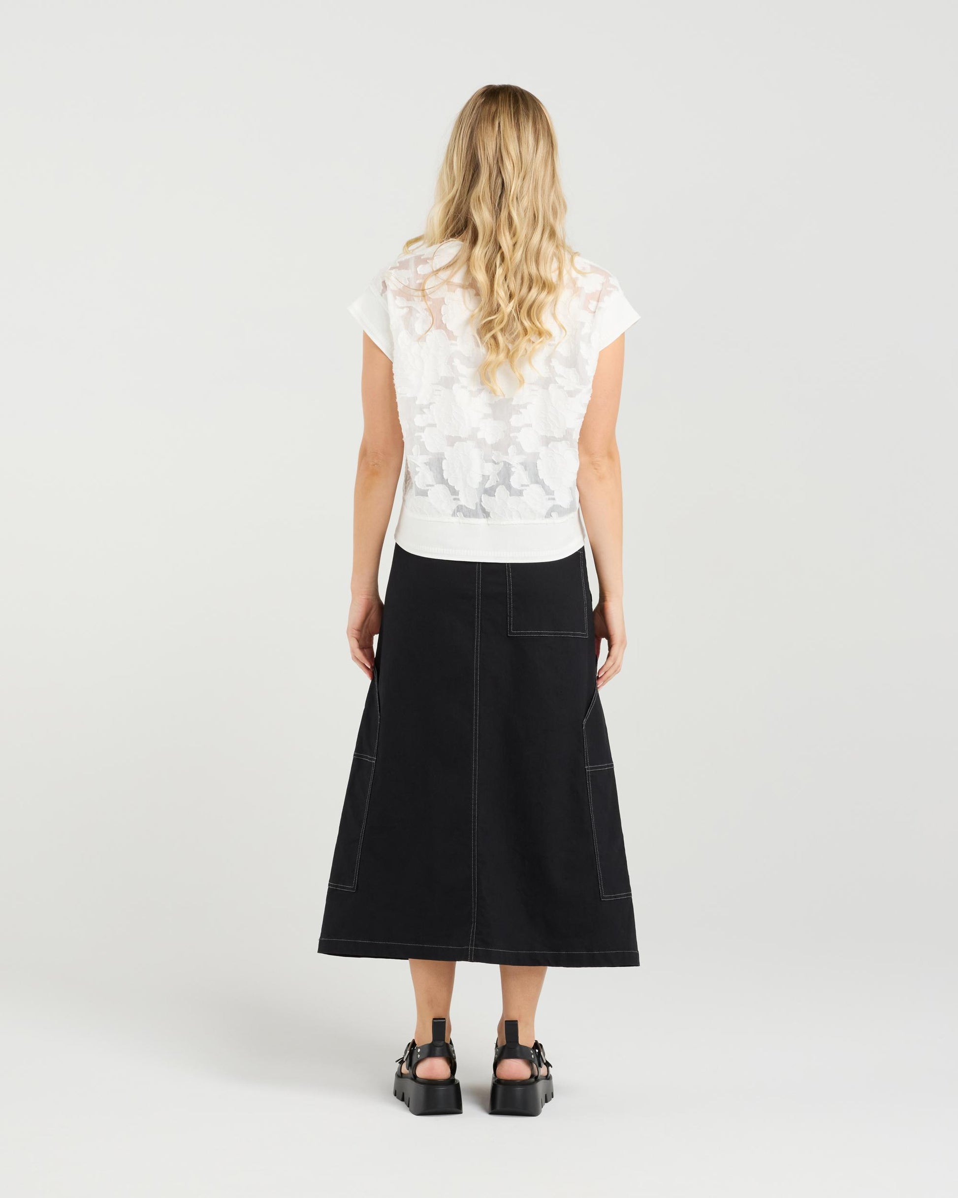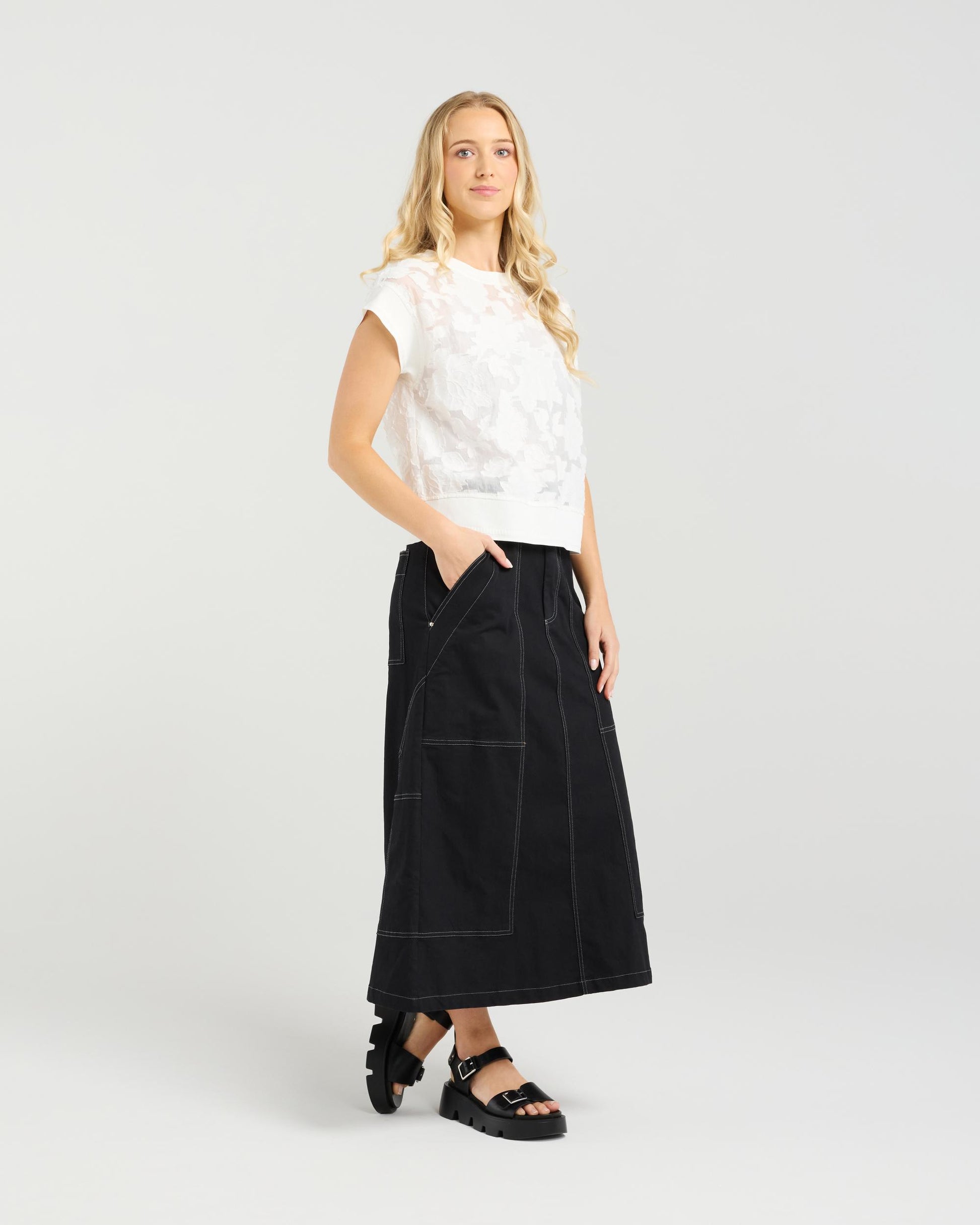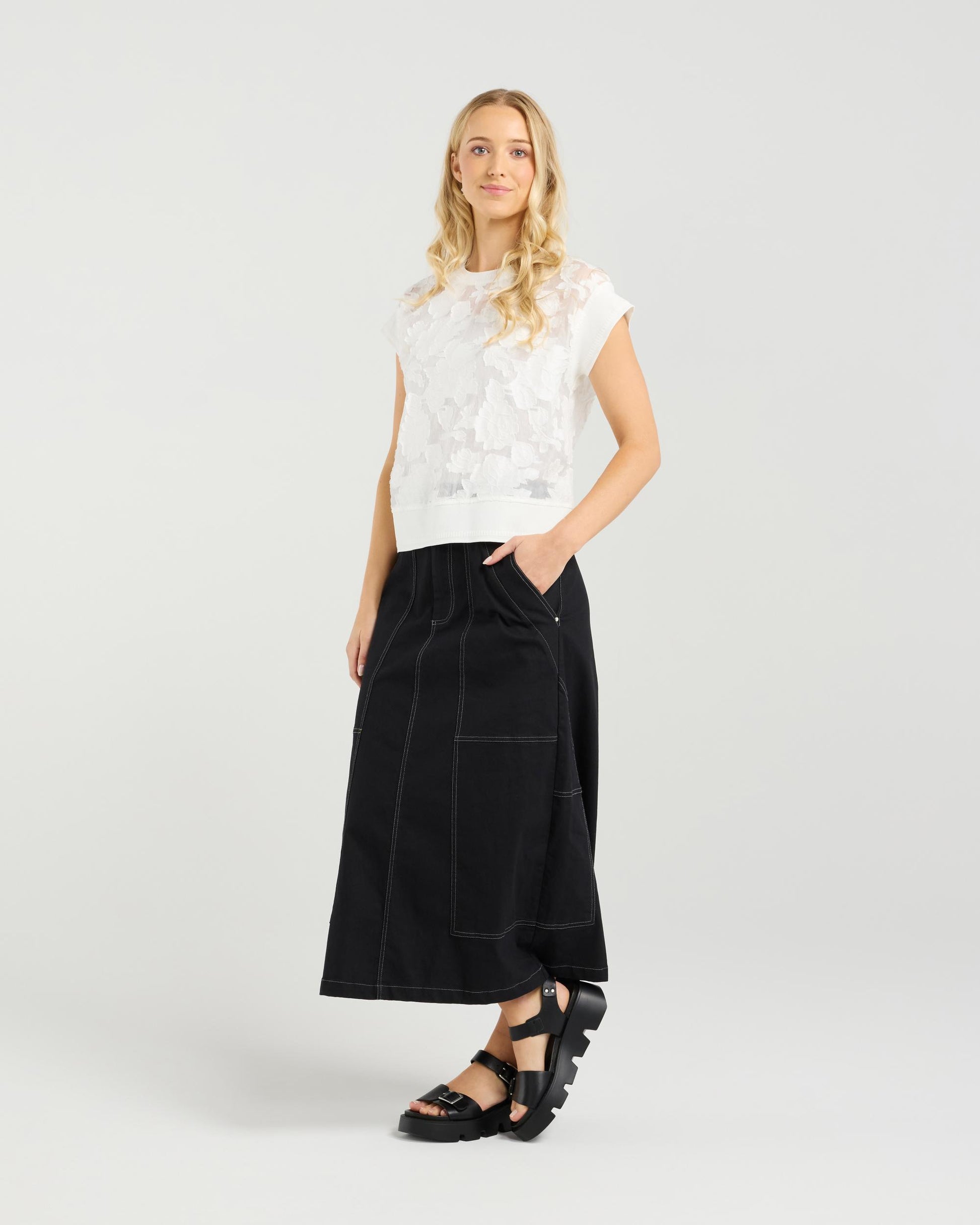A refined take on a wardrobe essential, this elevated tee is crafted from a gorgeous burnout fabric that offers a soft, semi-sheer texture with subtle depth. Designed for effortless sophistication, it's finished with ribbing at the neckline and cuffs—adding structure and contrast to the relaxed silhouette. Equally suited for layering or standalone wear, this piece brings understated elegance to everyday dressing.