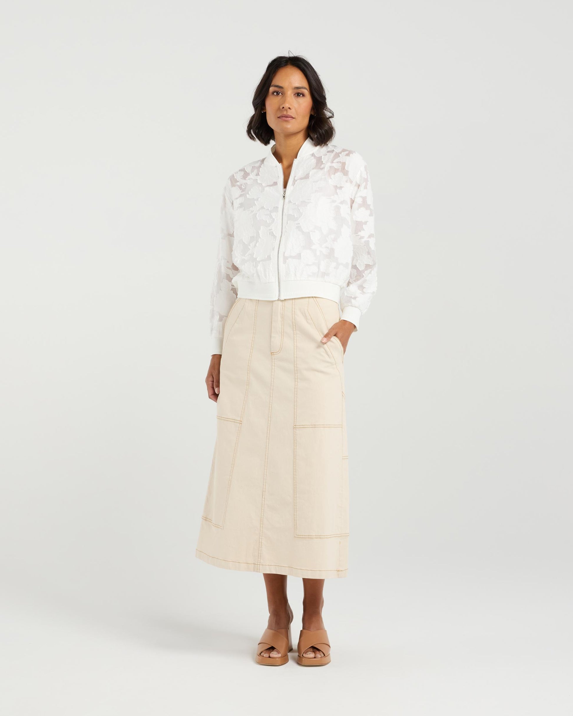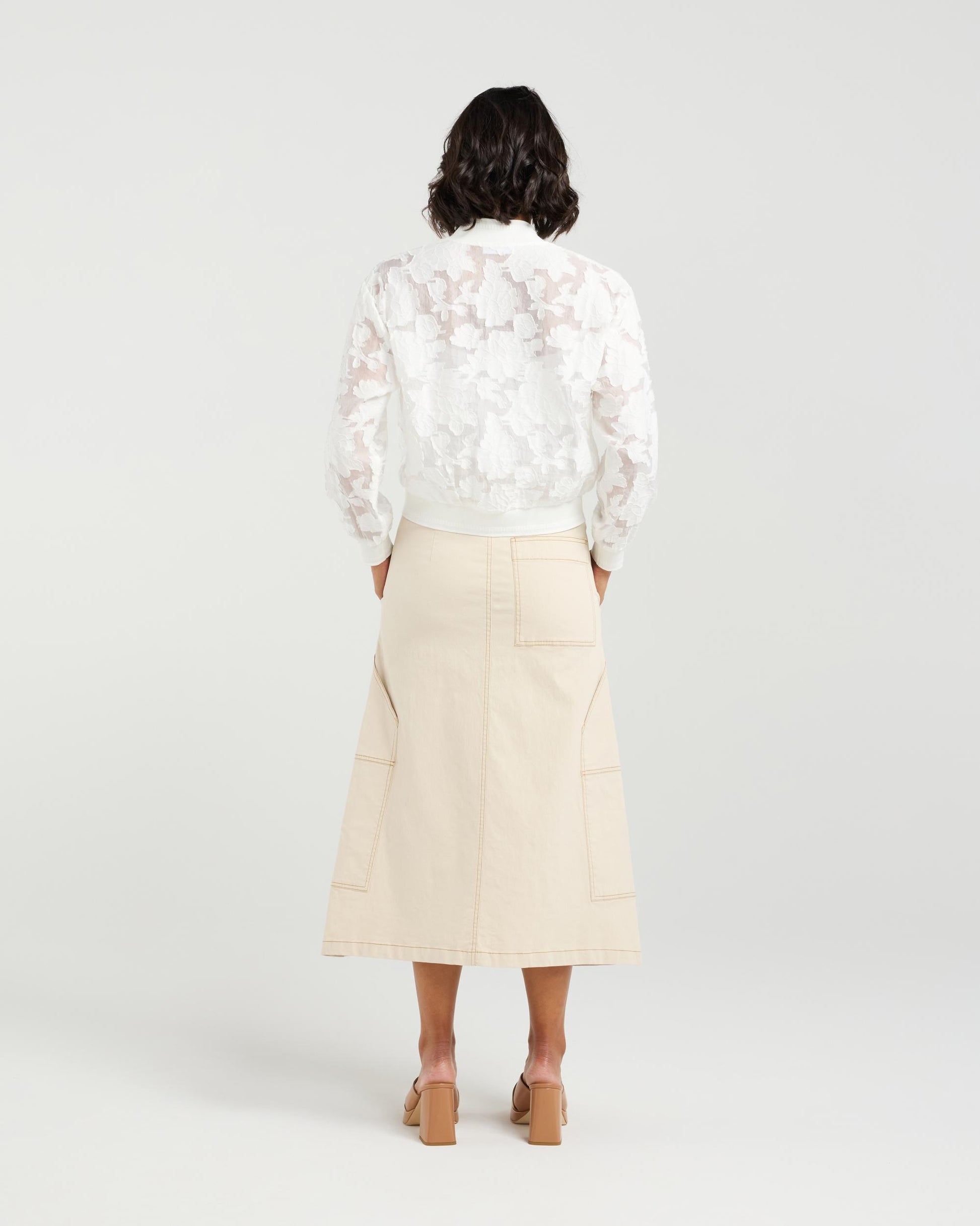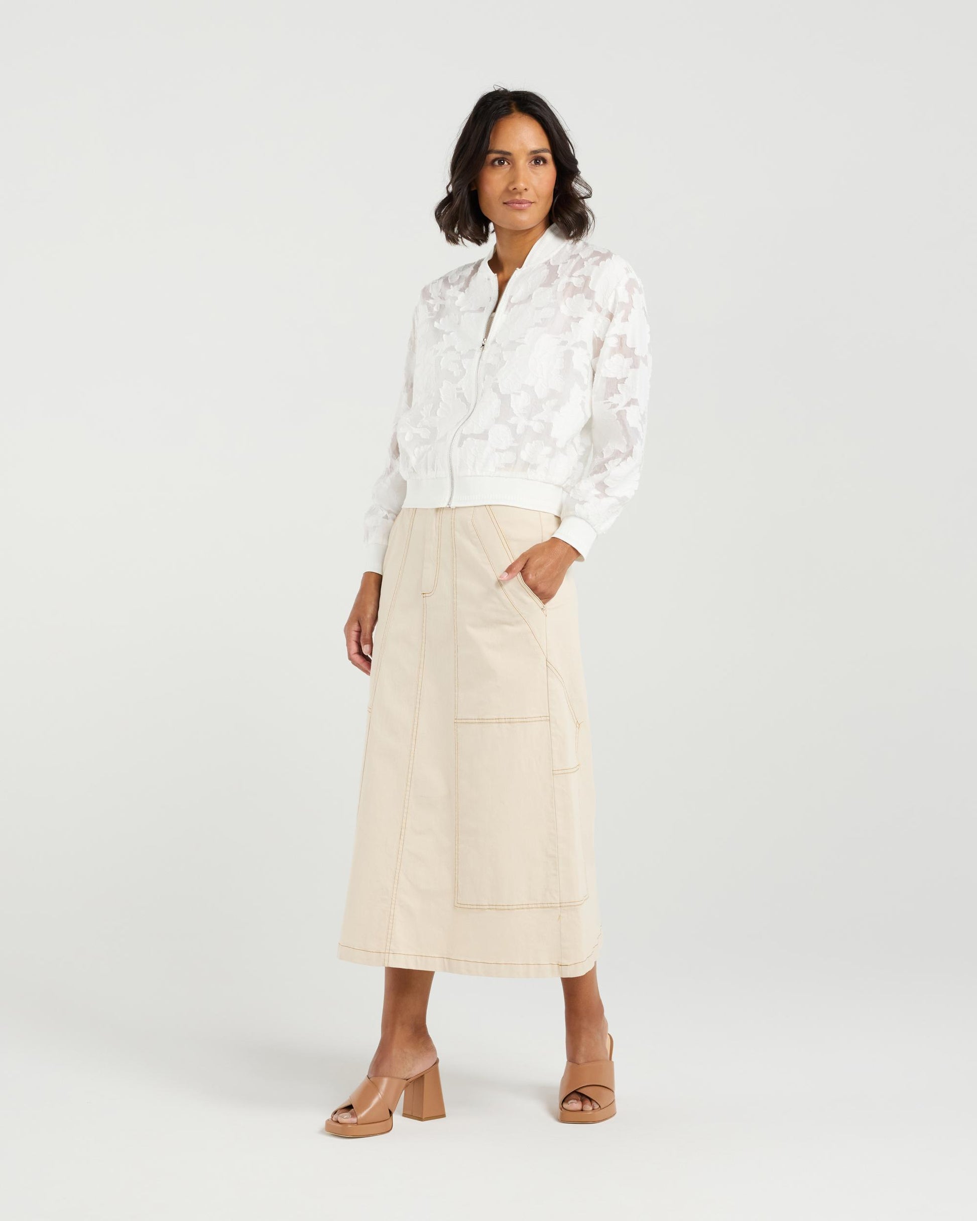 A fresh take on a classic silhouette, this bomber jacket is made in a beautiful burnout fabric that adds texture with a touch of sheer intrigue. The lightweight fabrication is finished with ribbing at the collar, cuffs, and hem band, giving structure to the airy feel of the fabric. Equal parts sporty and sophisticated, it’s the perfect statement layer for day-to-night styling.
