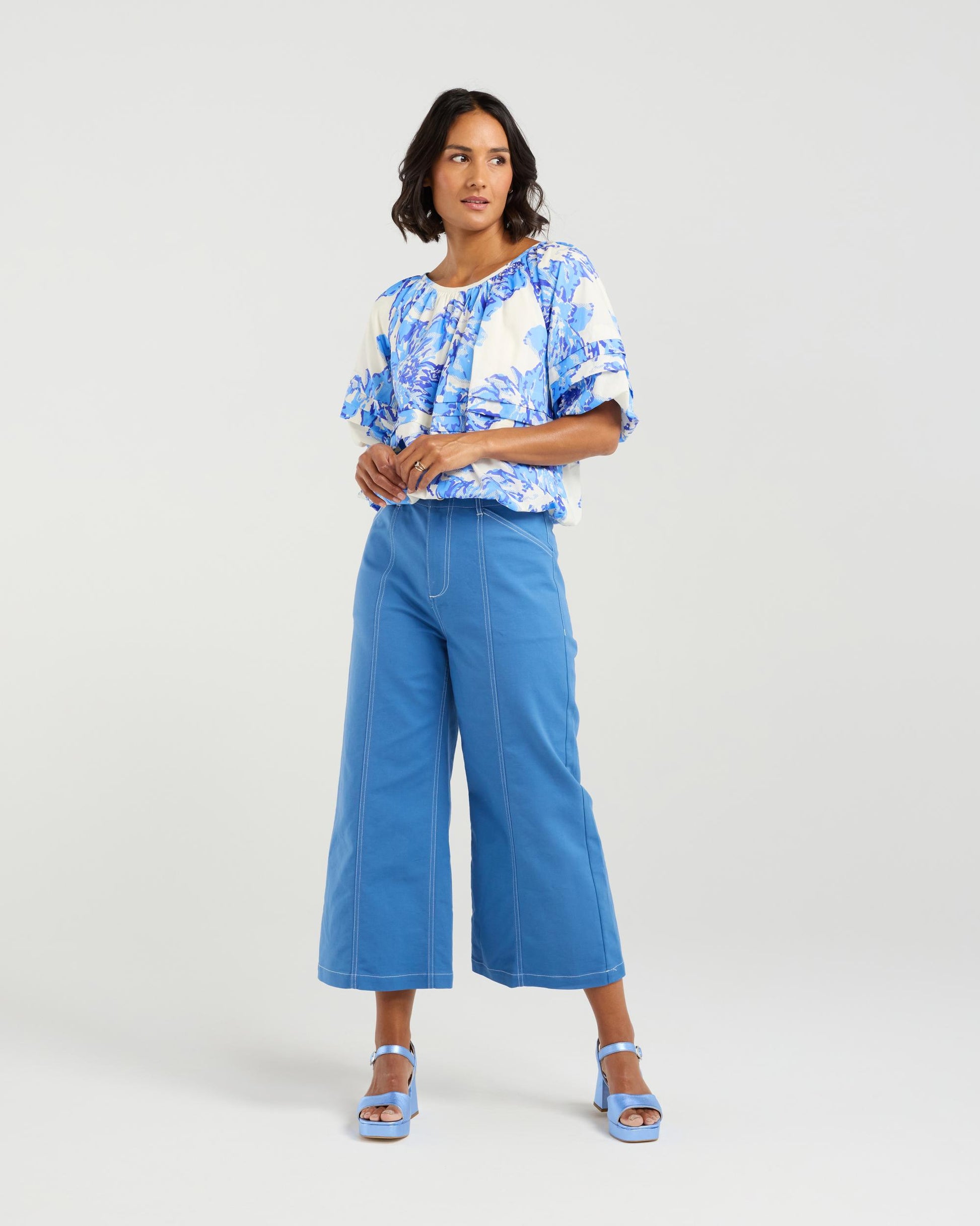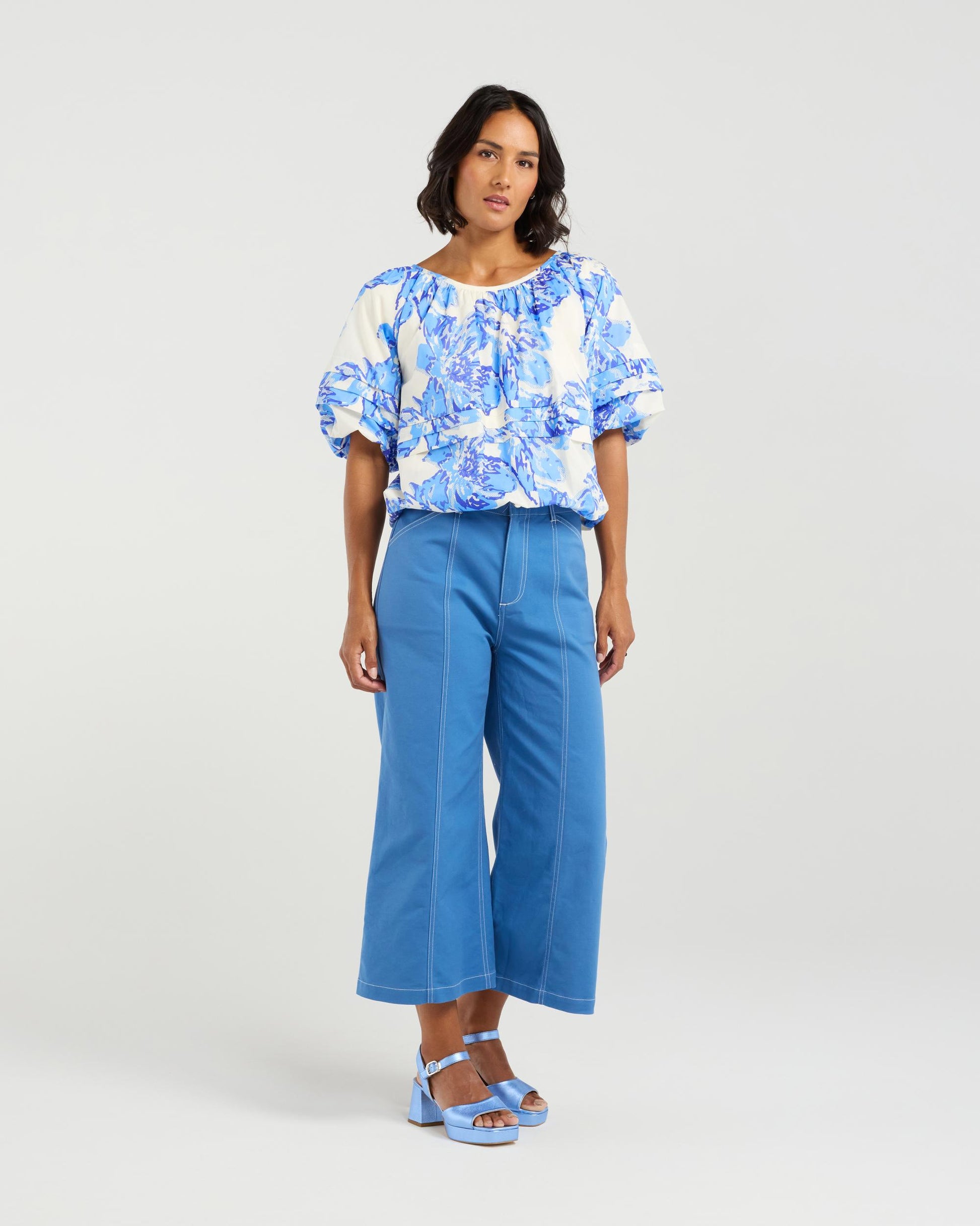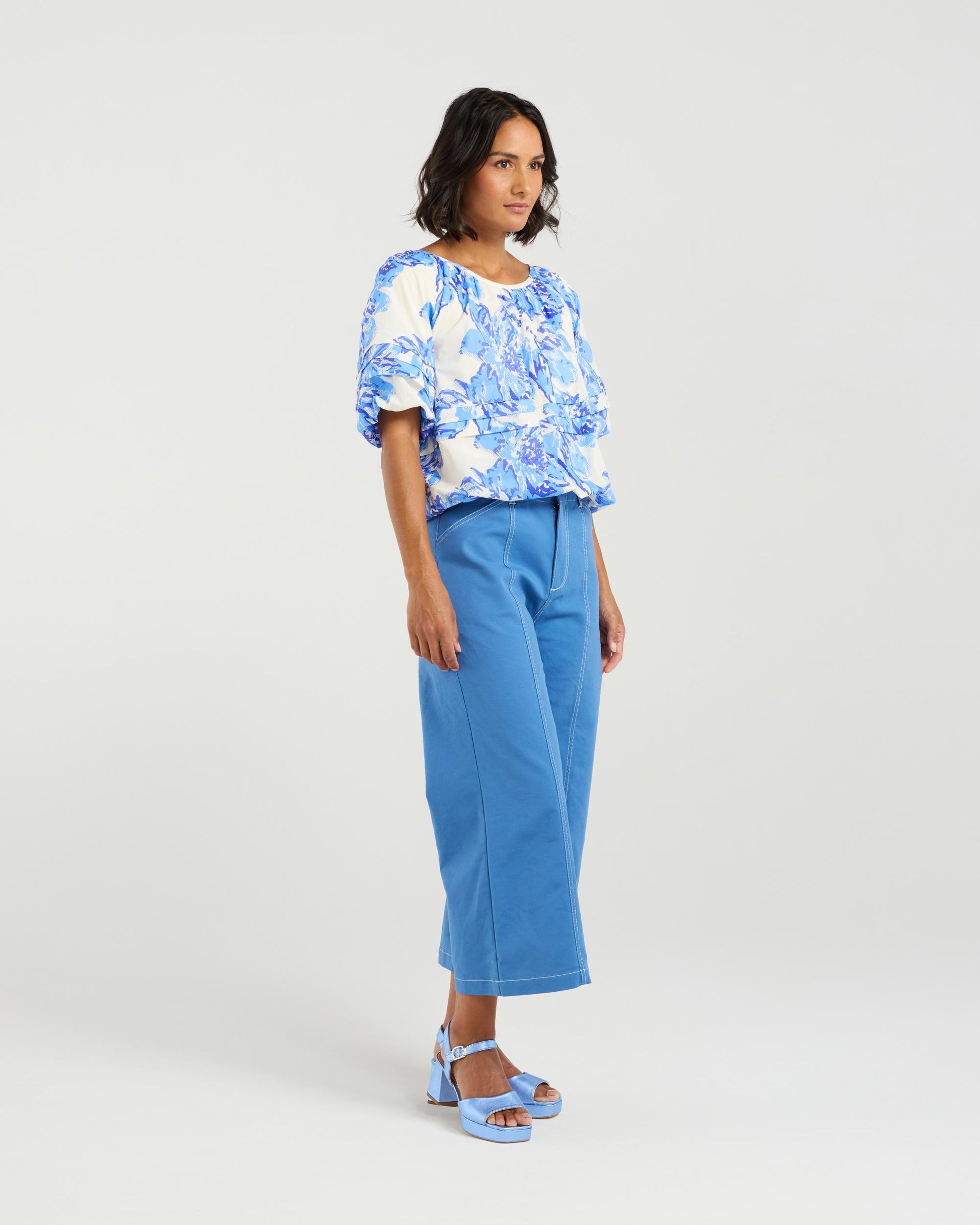 Embrace effortless elegance with this wide scoop neck top, crafted from a luxurious printed cotton. The subtly gathered neckline adds a touch of texture, while the pleat detailing around the body and sleeves adds a dynamic touch silhouette. With ballooned hems at the sleeve and waist give . This top seamlessly transitions from day to night with its timeless charm.