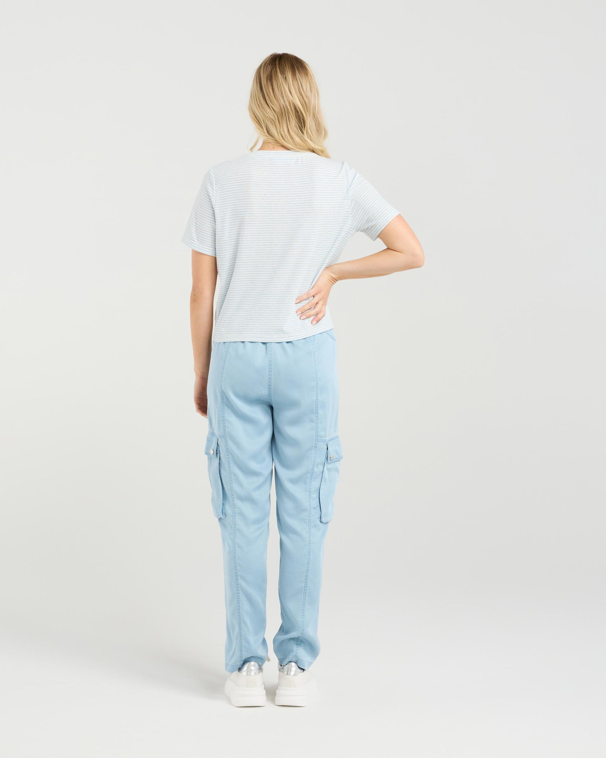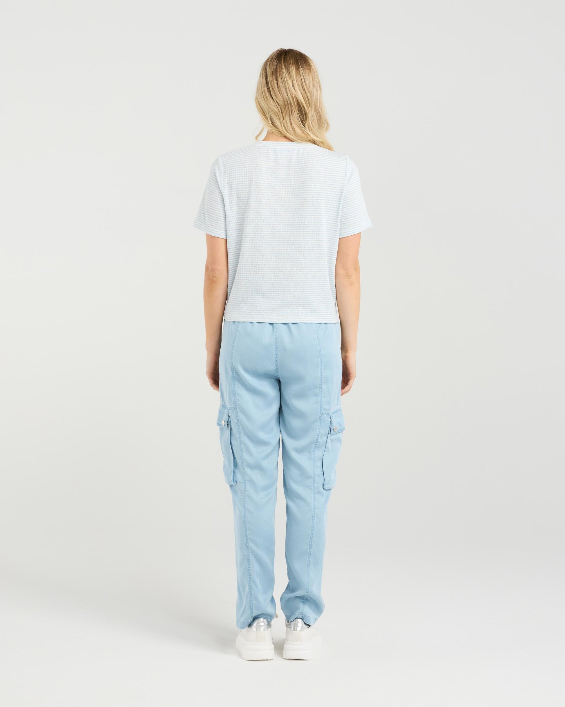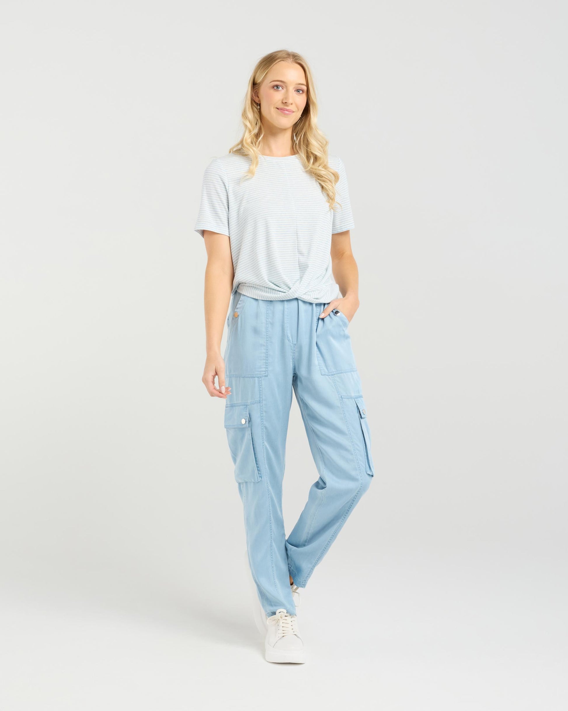 A must-have top for summer, perfect back with denim, high waisted wide leg pants, and trendy midi-skirts. Made out of Cotton blend rib knit and featuring round banded neckline, and a flattering twisted detail on the front, this is sure to become your go-to tee for summer.