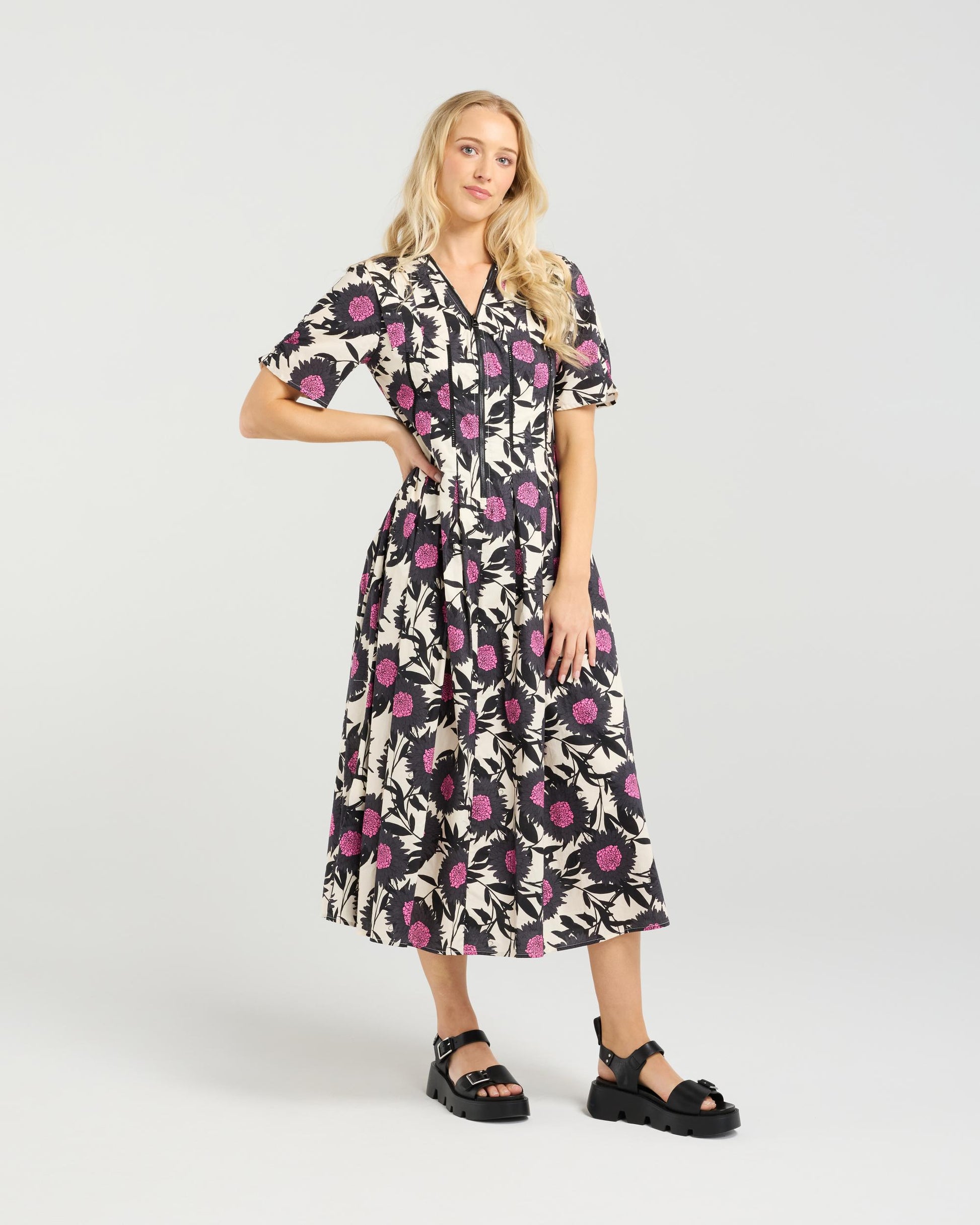 The Vera dress combines classic tailoring with contemporary details. The zip-front design offers both functionality and a modern edge, while the ladder lace inserts at the waist add a touch of intricate texture and femininity. The fully lined fitted silhouette flatters the figure, making it suitable for both professional settings and evening outings.